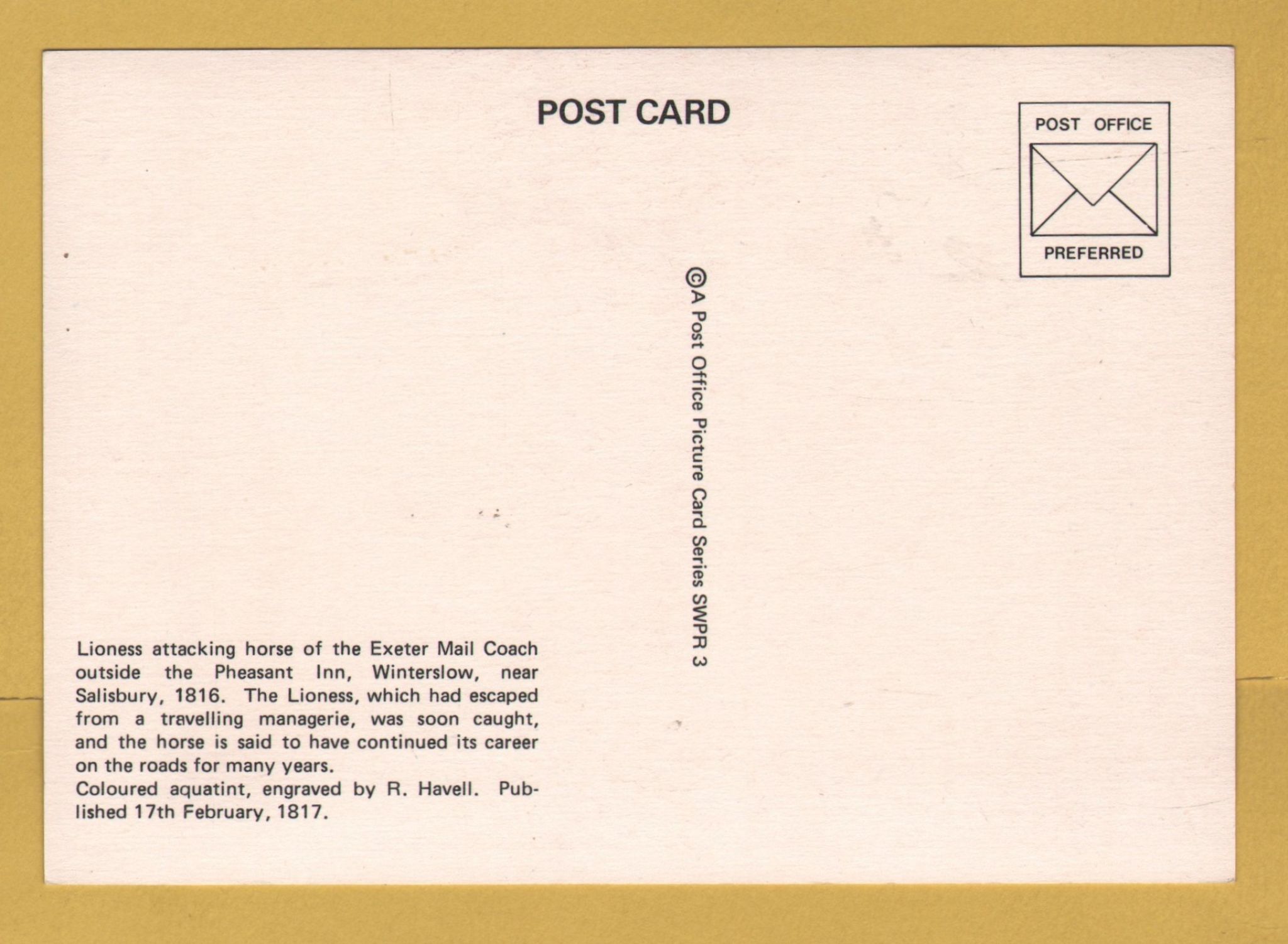 `Lioness Attacking the Horse of the Exeter Mail Coach` - Post Office Series SWPR 3 - Postally Unused - Post Office Postcard. `Lioness Attacking the Horse of the Exeter Mail Coach` - Post Office Series SWPR 3 - Postally Unused - Post Office Postcard.