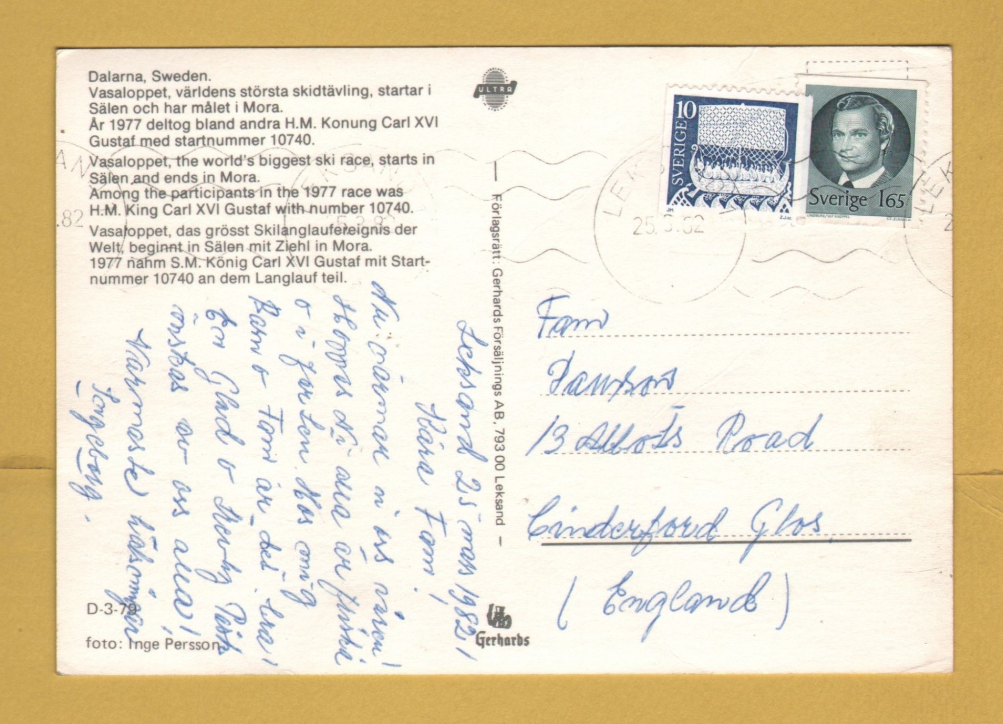 Tags: Vasaloppet, Salen, Mora:Used, 1982, Gerhards Postcard.