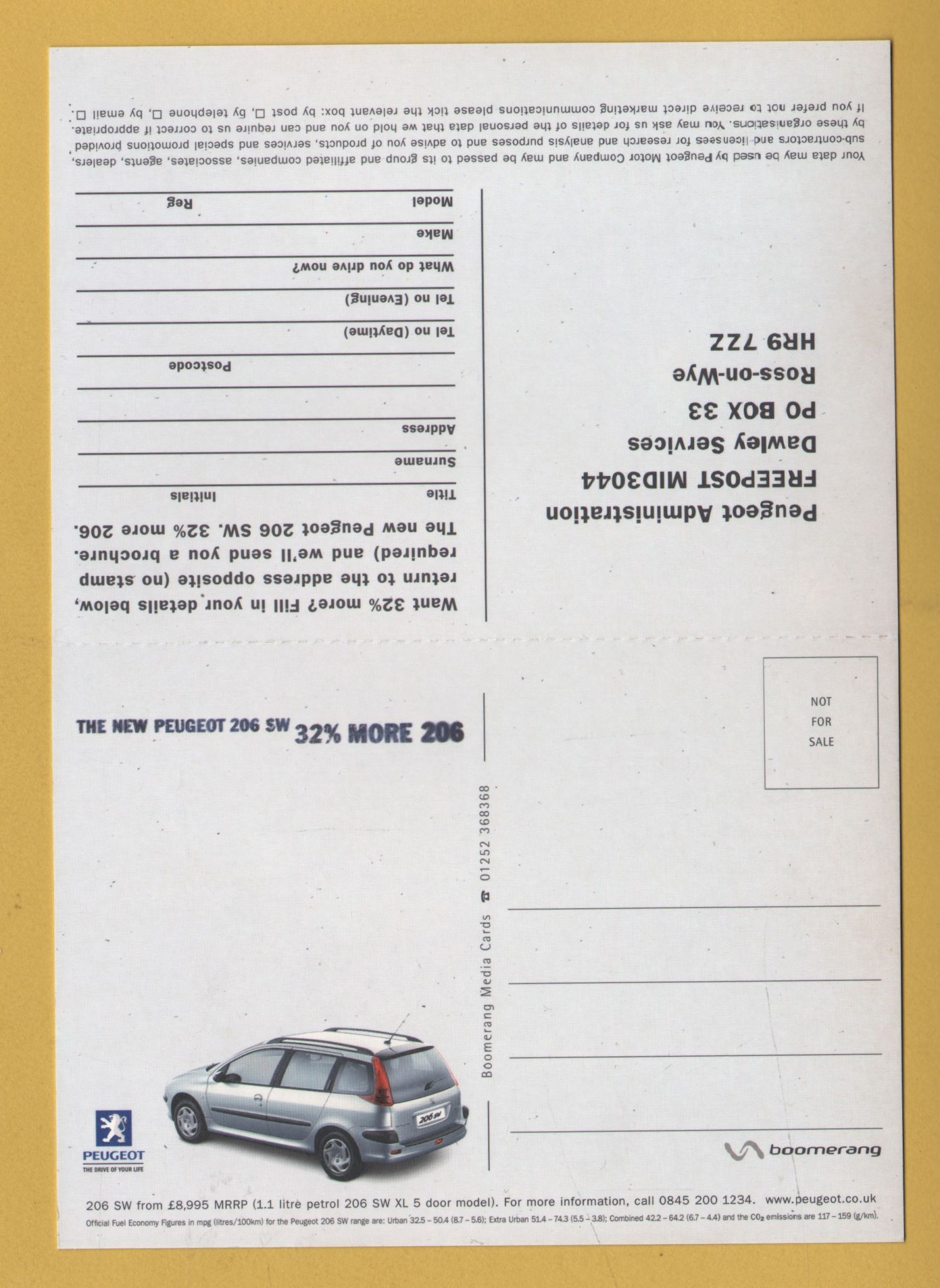 Tags: New Peugeot 206sw, 32% more 206, Fold Out:Unused, Boomerang Media Postcard.