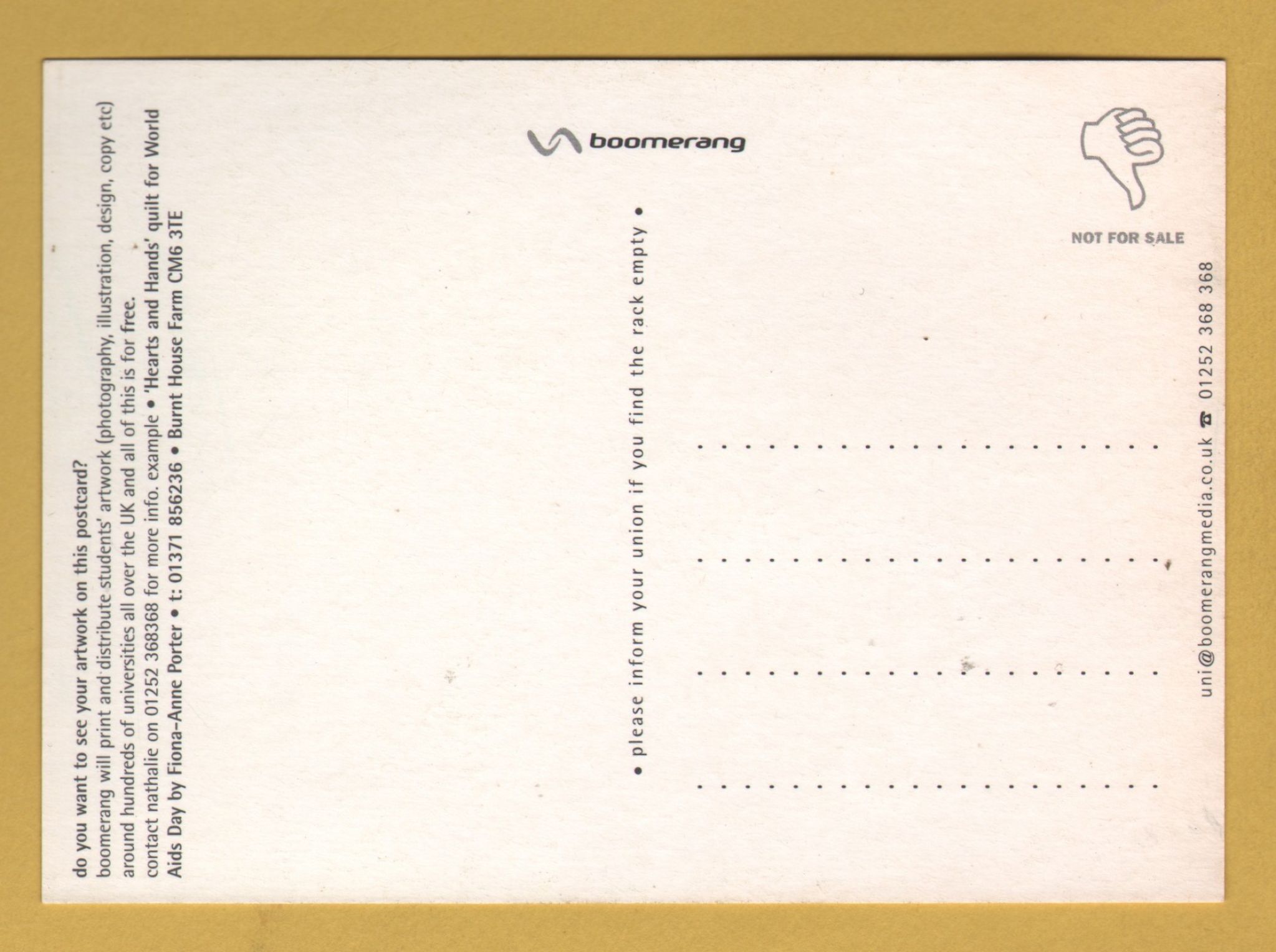 `Hearts and Hands Quilt For World Aid`s Day` - Postally Unused - Boomerang Media Postcard. `Hearts and Hands Quilt For World Aid`s Day` - Postally Unused - Boomerang Media Postcard.