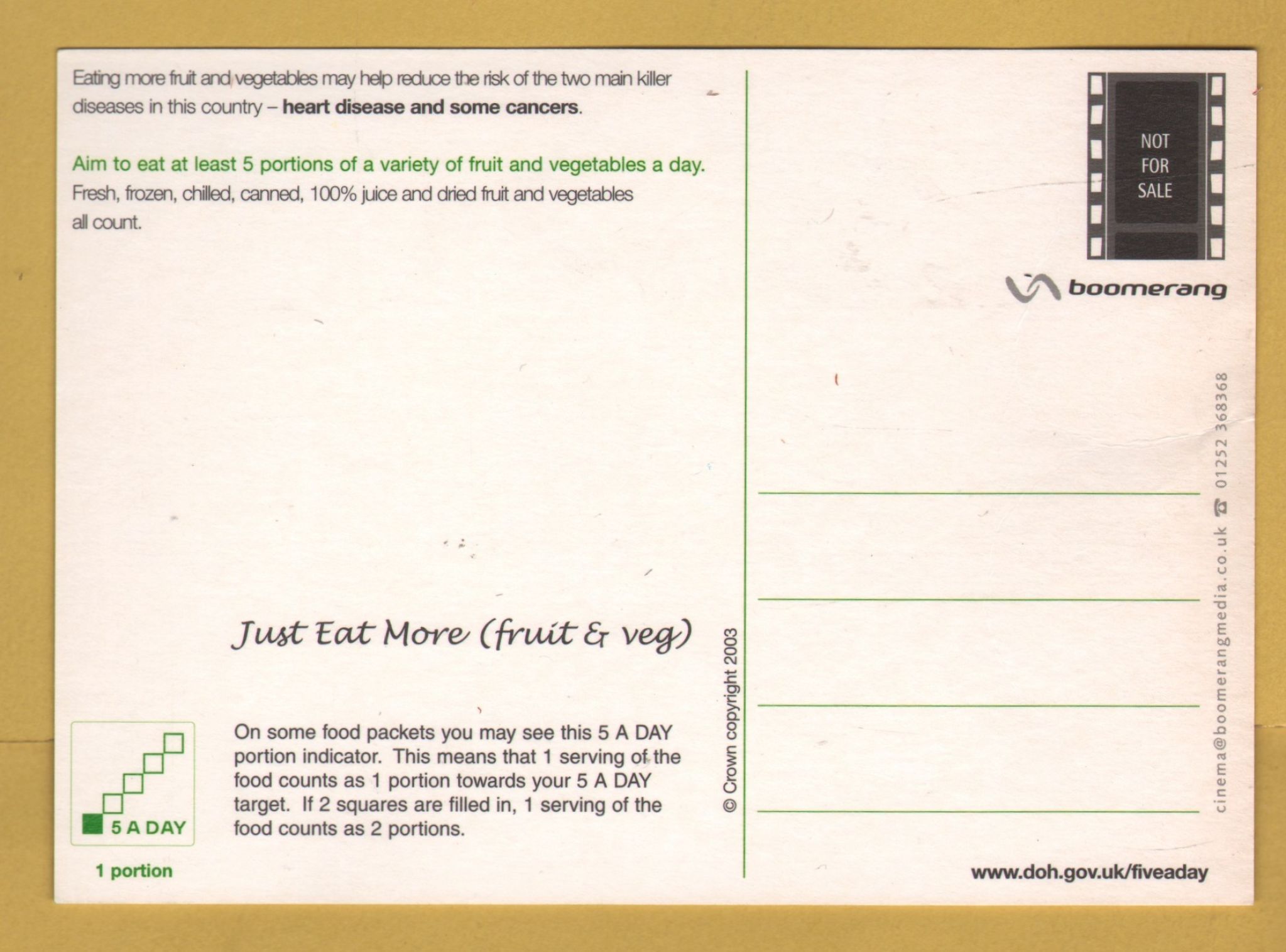 Tags: Just Eat More Fruit, (Fruit & Veg), NHS:Unused, Boomerang Media Postcard.