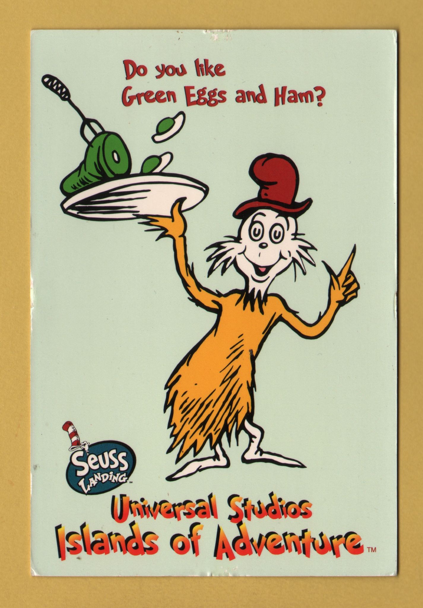 `Universal Studios, Island of Adventure - Seuss Landing - Do You Like Green Eggs and Ham?` - Postally Unused - Dr Seuss Postcard.