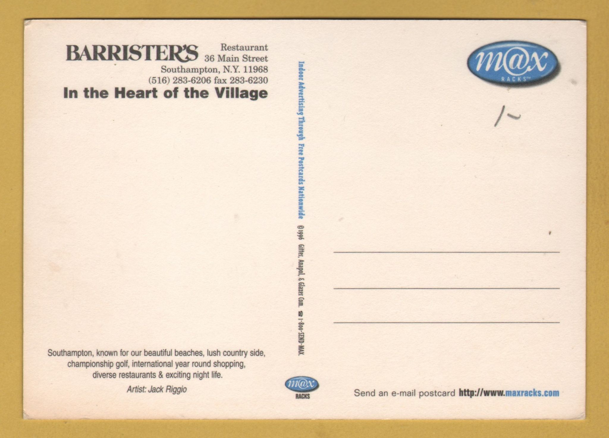 Tags: BARRISTER`S Restaurant, Southampton, New York:Unused, M@x Racks Postcard.