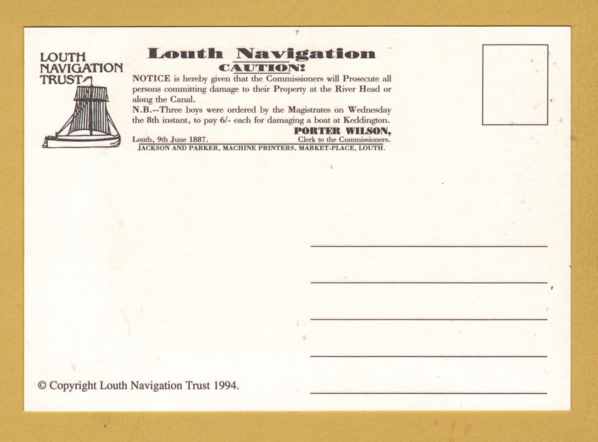 `Louth Navigation Trust - 1994`- Postally Unused - Trust Postcard.