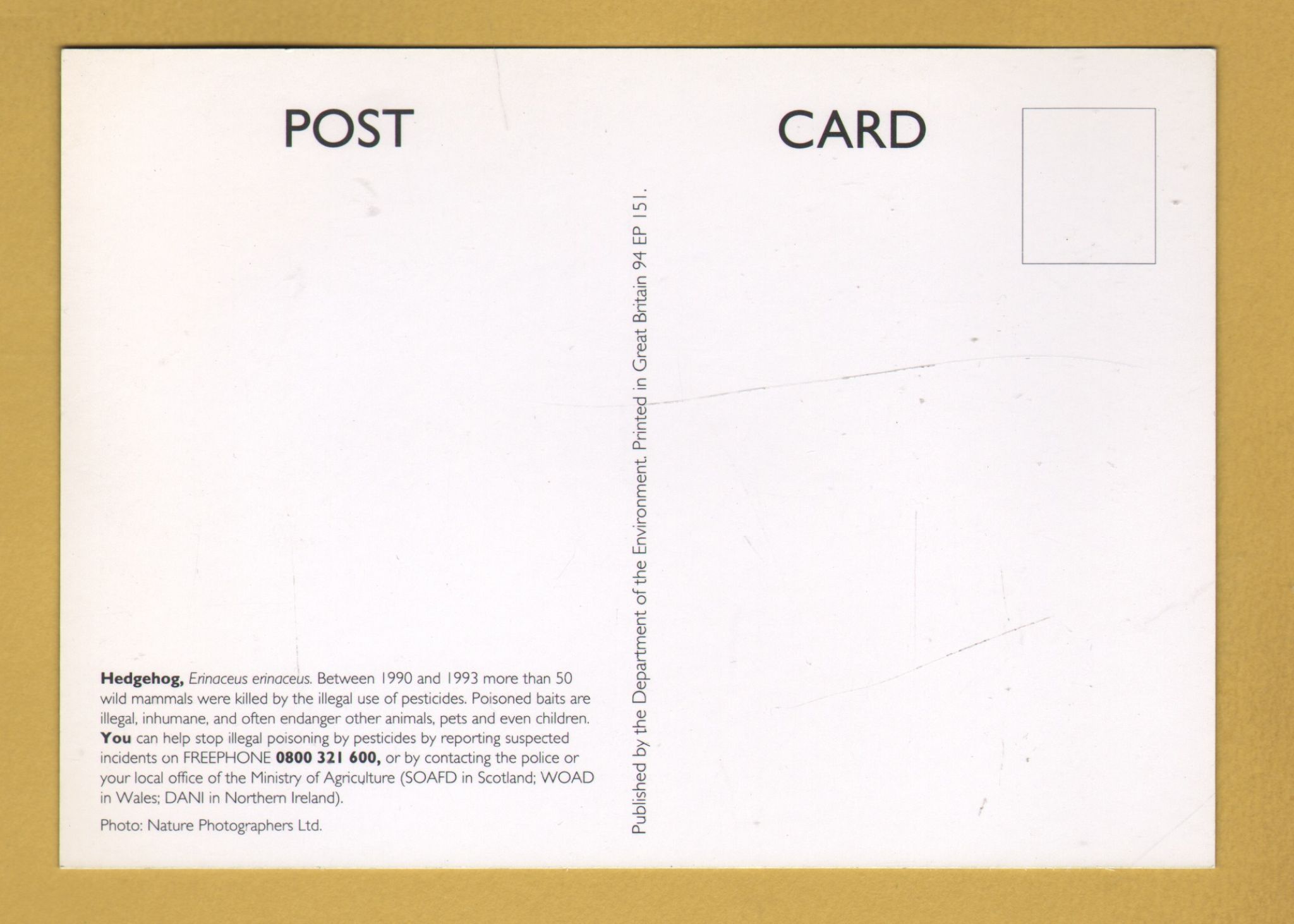 Tags: Stop Illegal POISONING of Our Wildlife, Hedgehog:Unused, DoE Postcard.