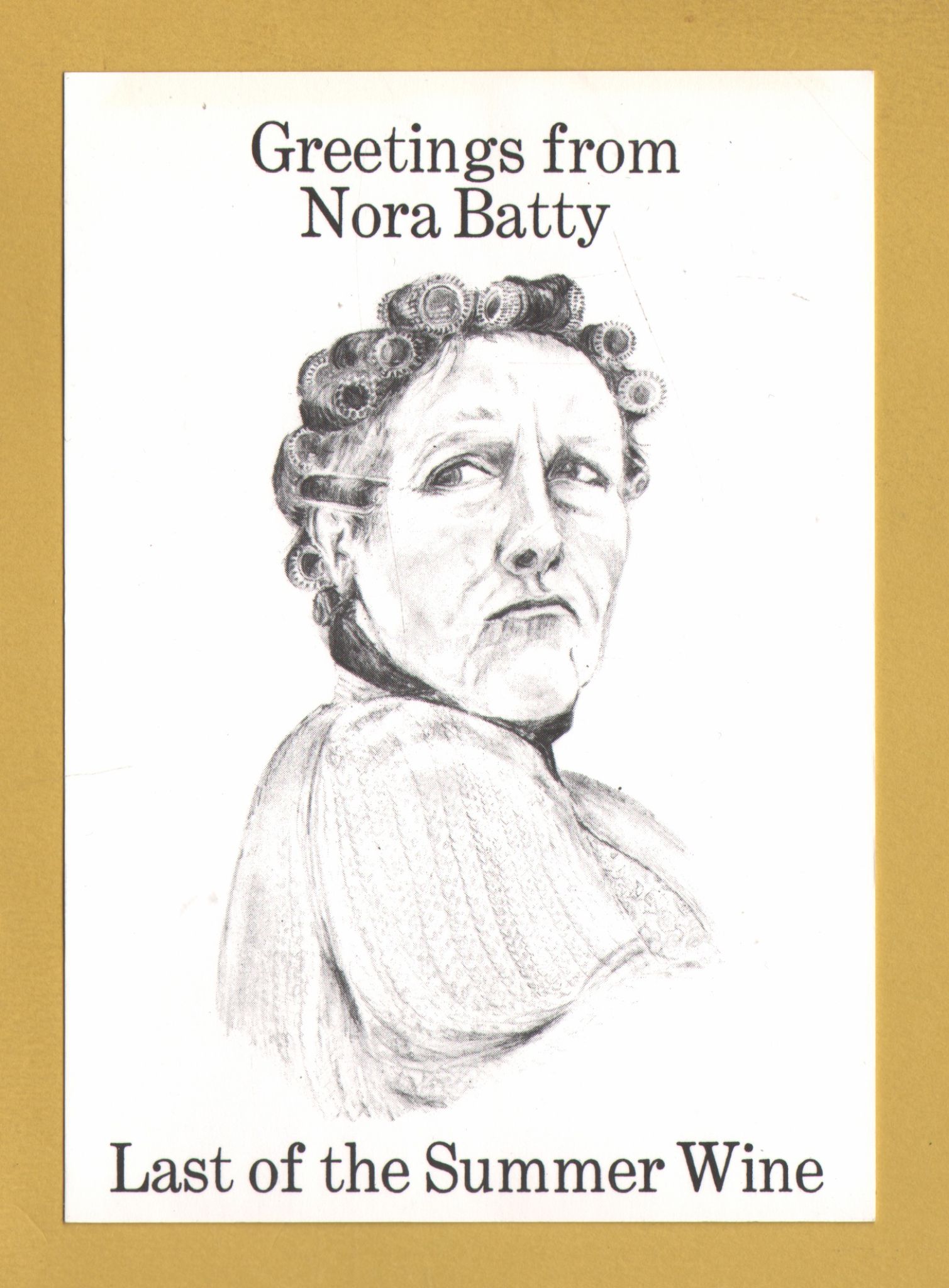 `Last of the Summer Wine - Greetings From Nora Batty by Jeanette Leadbeater`- Postally Unused - Victoria Press Postcard. `Last of the Summer Wine - Greetings From Nora Batty by Jeanette Leadbeater`- Postally Unused - Victoria Press Postcard.