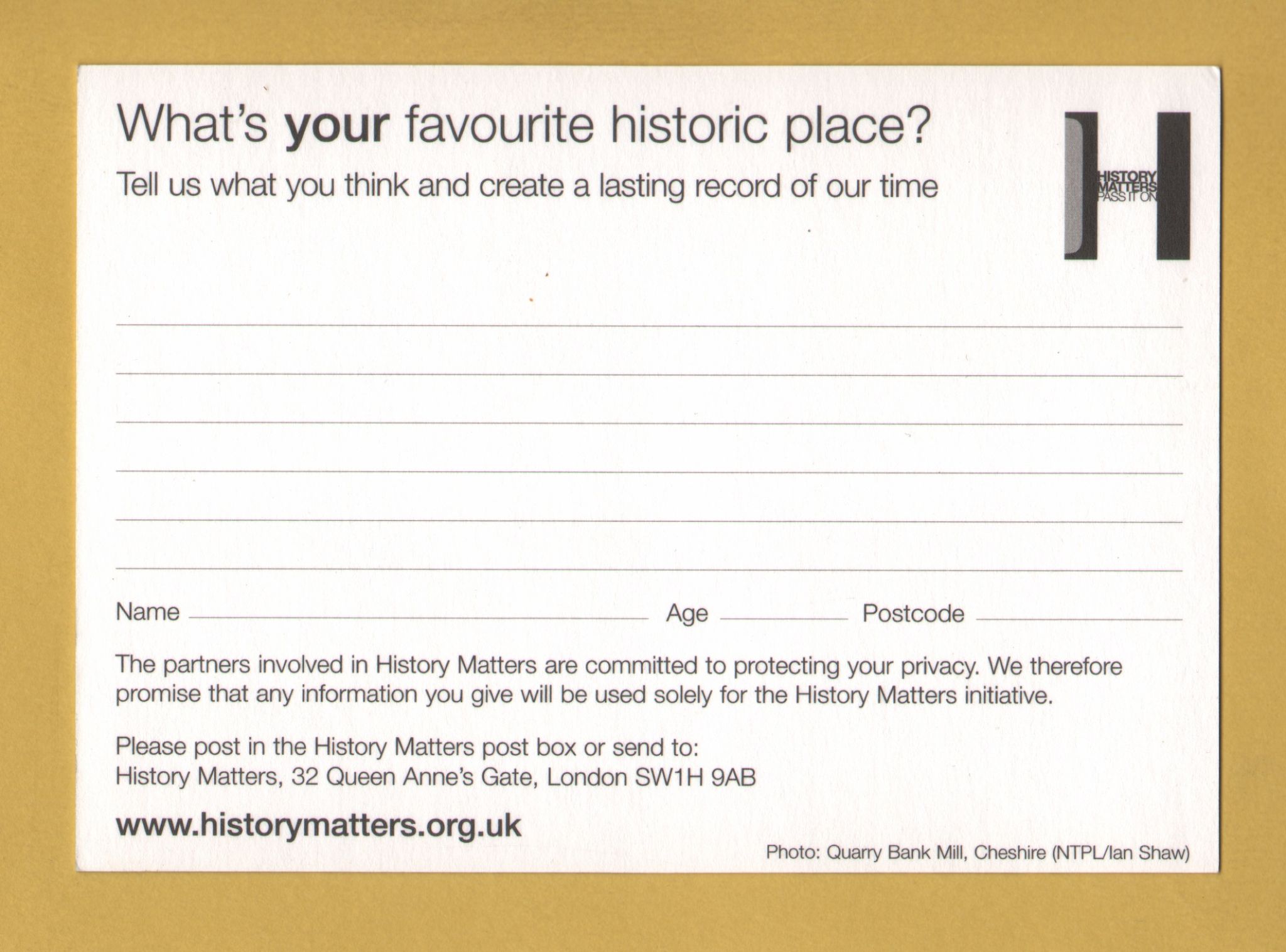 `History Matters - What`s Your Favourite Historic Place?`- Postally Unused - History Matters Postcard.