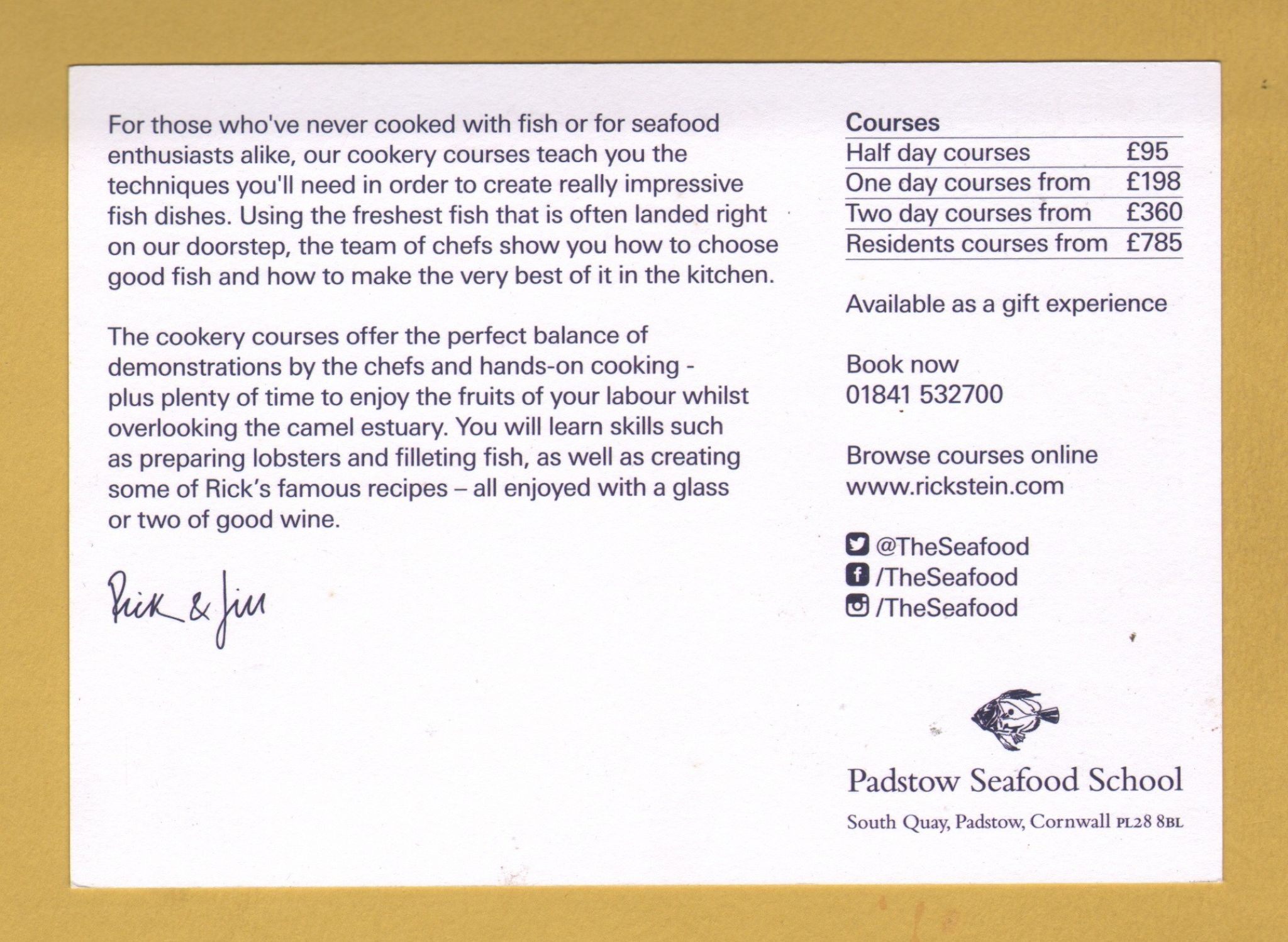 `Join us at Pladstow Seafood School, South Quay, Padstow`- Postally Unused - Rick Stein Postcard.