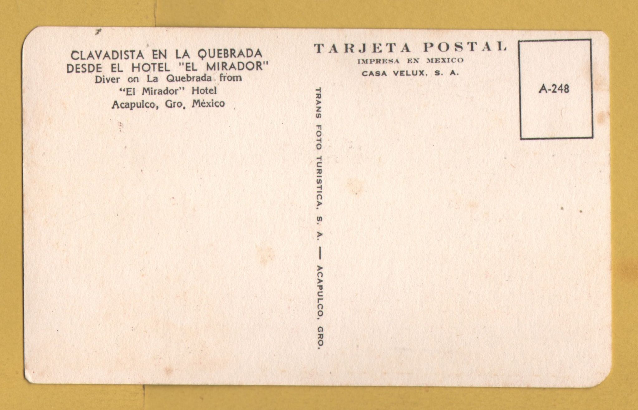 `Diver on La Quebrada from the "El Mirador Hotel", Acapulco...`- Postally Unused - Velux House Postcard. `Diver on La Quebrada from the "El Mirador Hotel", Acapulco...`- Postally Unused - Velux House Postcard.