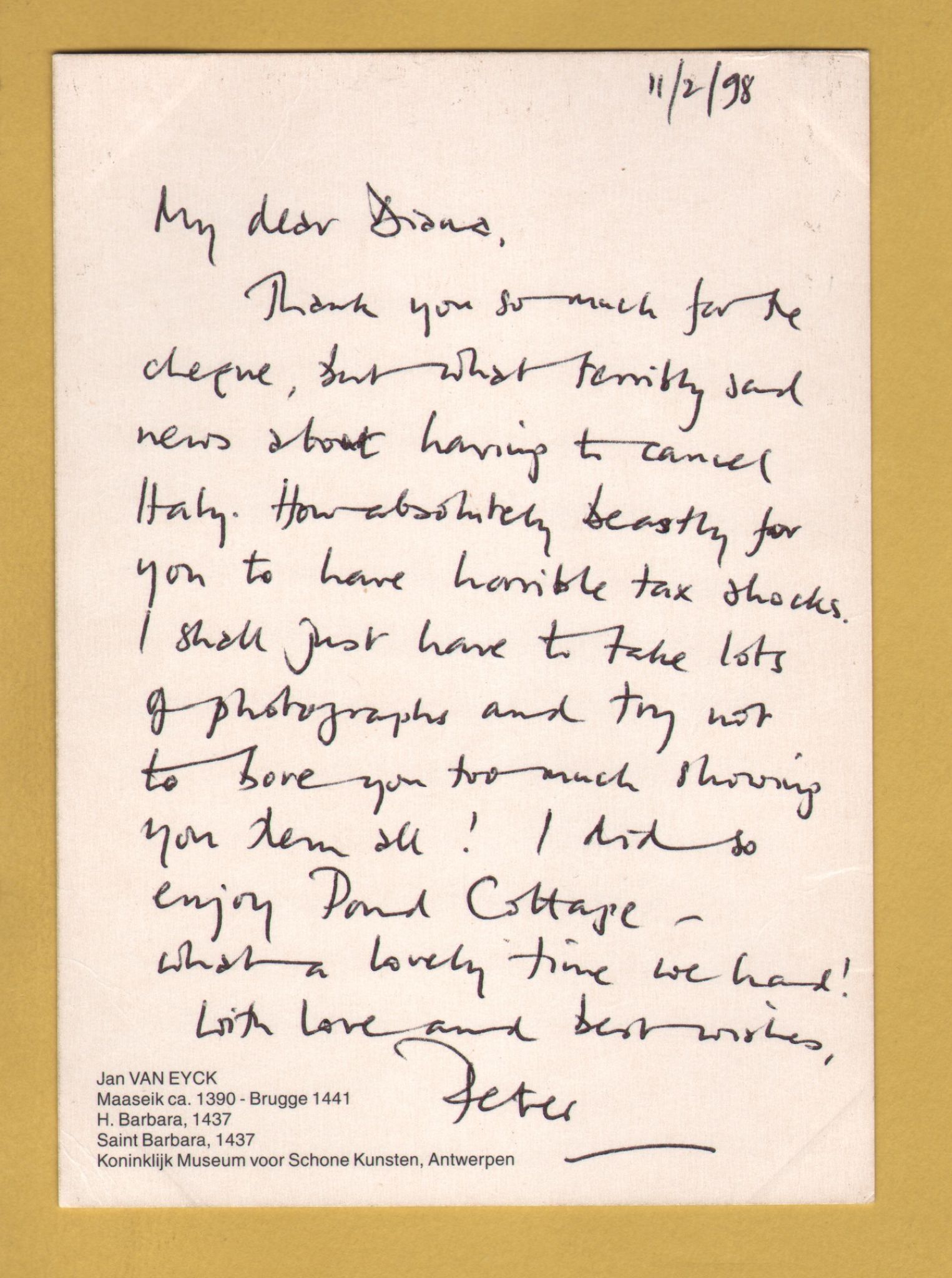 `St Barbara 1437 by Jan van Eyck - Royal Museum of Fine Arts, Antwerp` - Postally Unused (although message written to rear) - Museum Postcard.