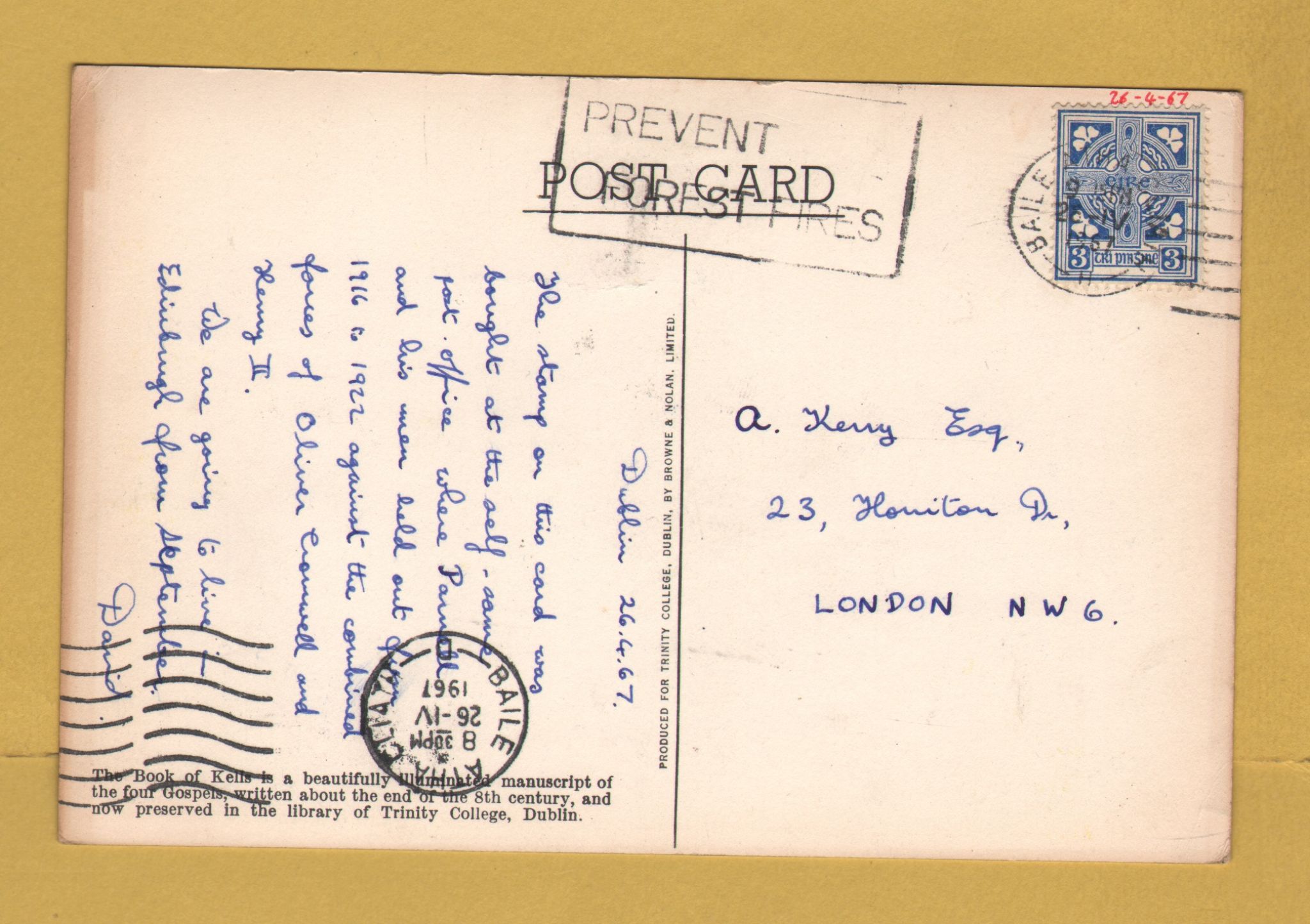 `The Book of Kells - Beautifully Illuminated Manuscript of the Four Gospels` - Postally Used-1967 - Browne & Nolan Postcard.