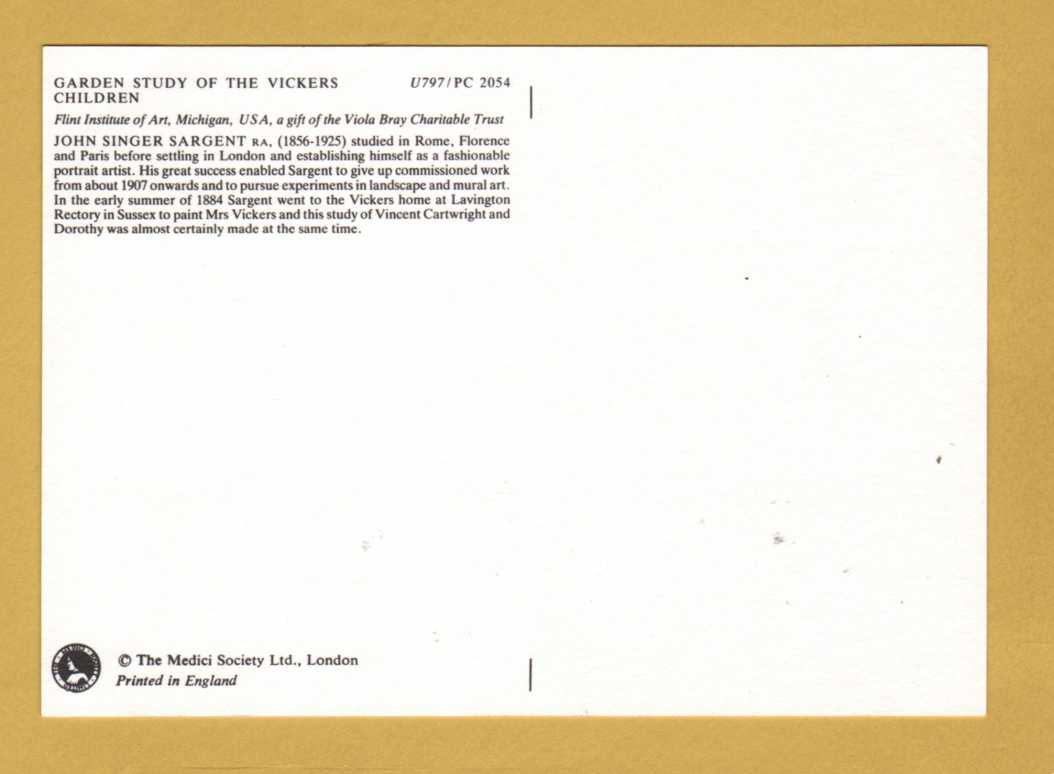 `Garden Study of the Vickers Children by John Singer Sargent` - Postally Unused - The Medici Society Postcard.