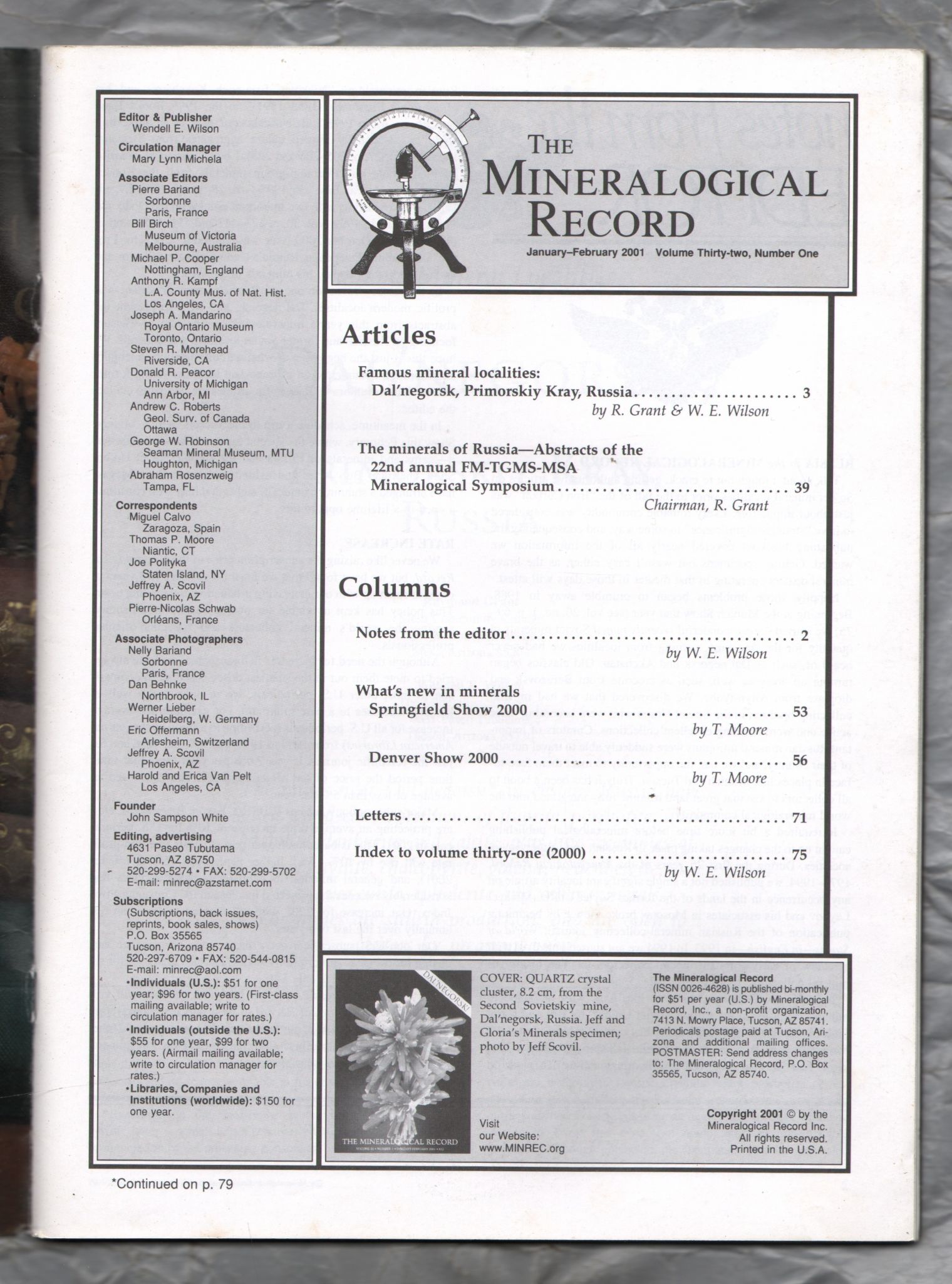 The Mineralogical Record - Jan/Feb 2001 - Vol.32 No.1 - `Famous Mineral Localities: Dal`negorsk, Primorskiy Kray, Russia` - Mineralogical Record Inc.