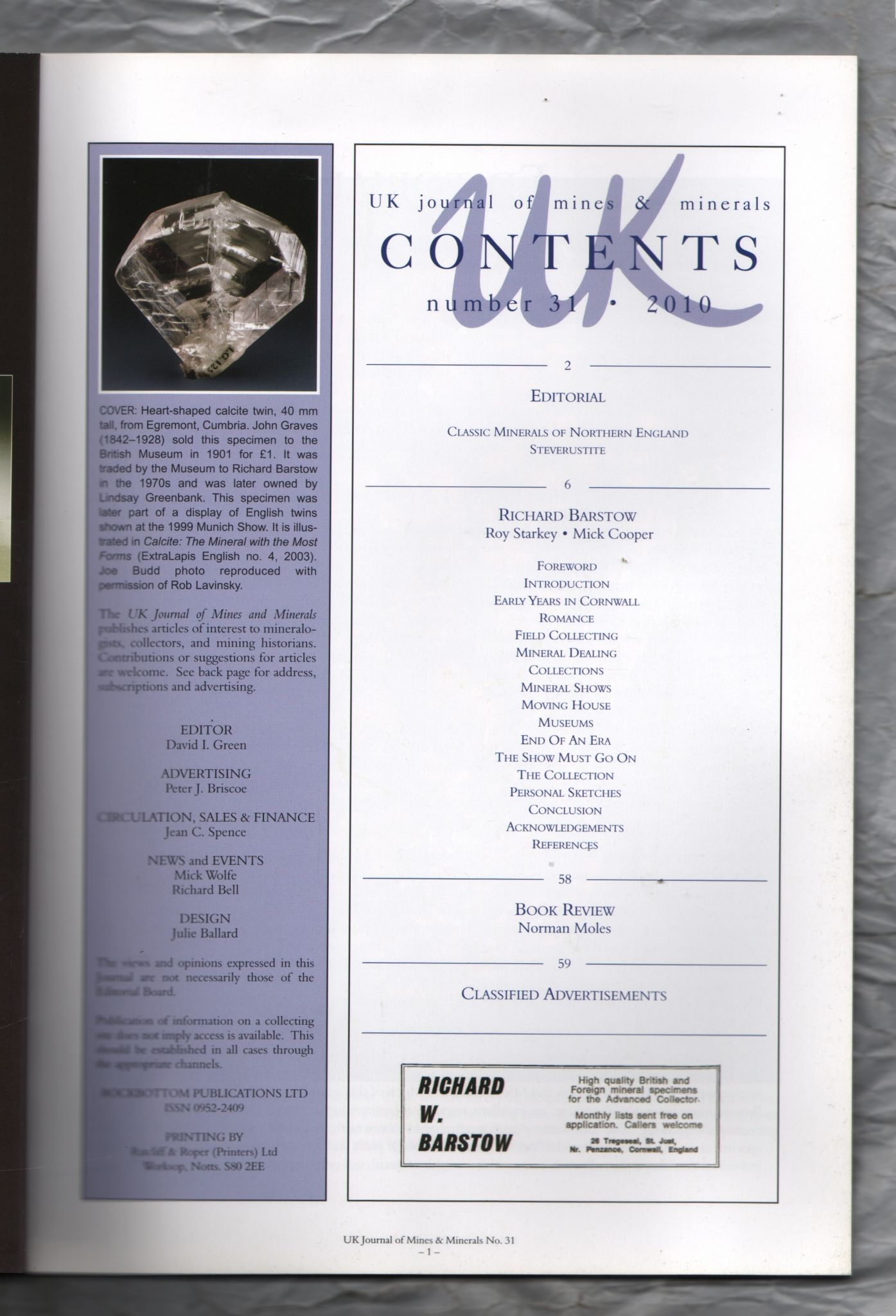 U.K Journal of Mines & Minerals - 2010 - No.31 - `Richard W.Barstow - Mineral Dealer Extraordinaire` - Rockbottom Publications Ltd