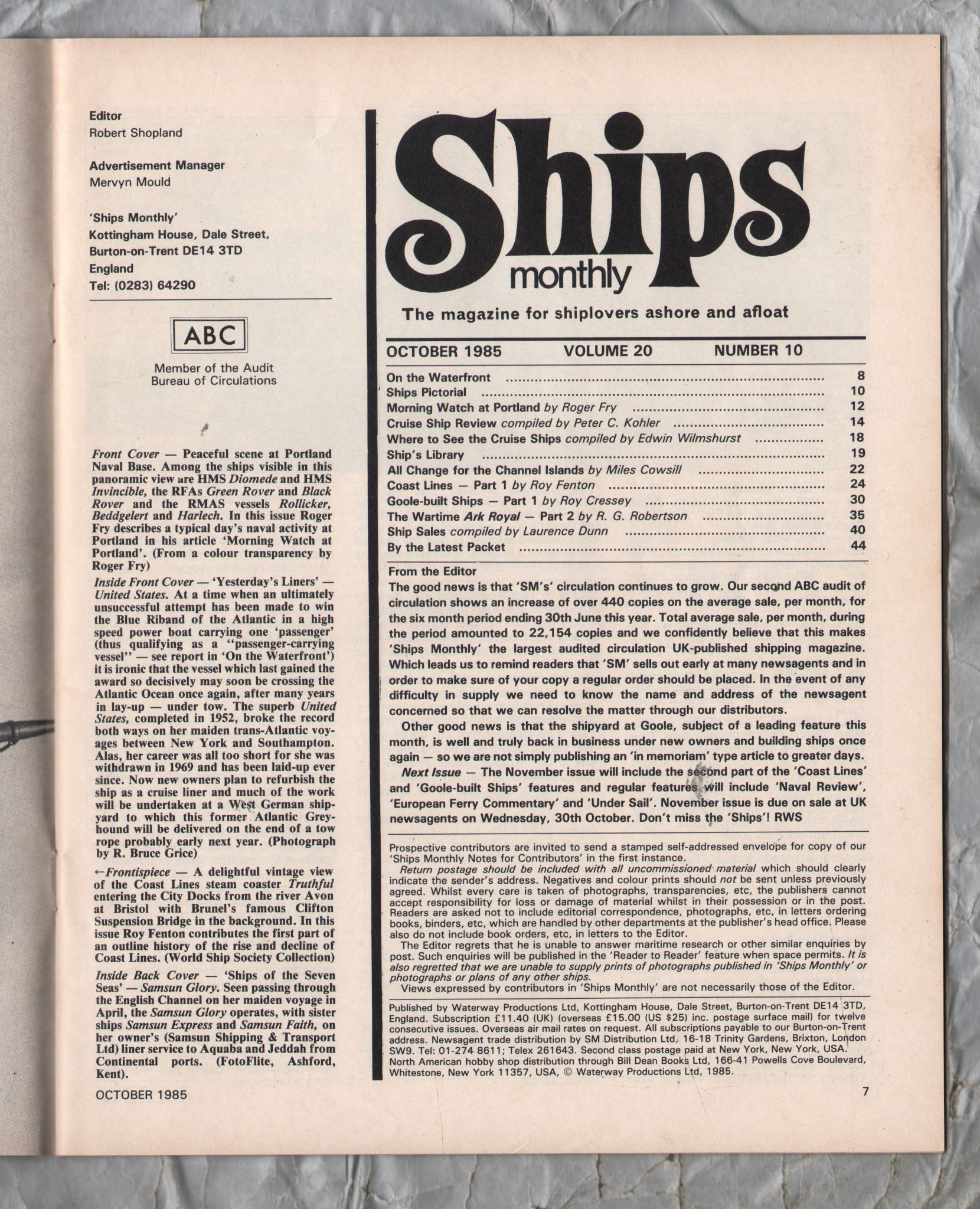 Ships Monthly - October 1985 - Vol 20 - No.10 - `The Wartime Ark Royal` - Waterway Productions Limited