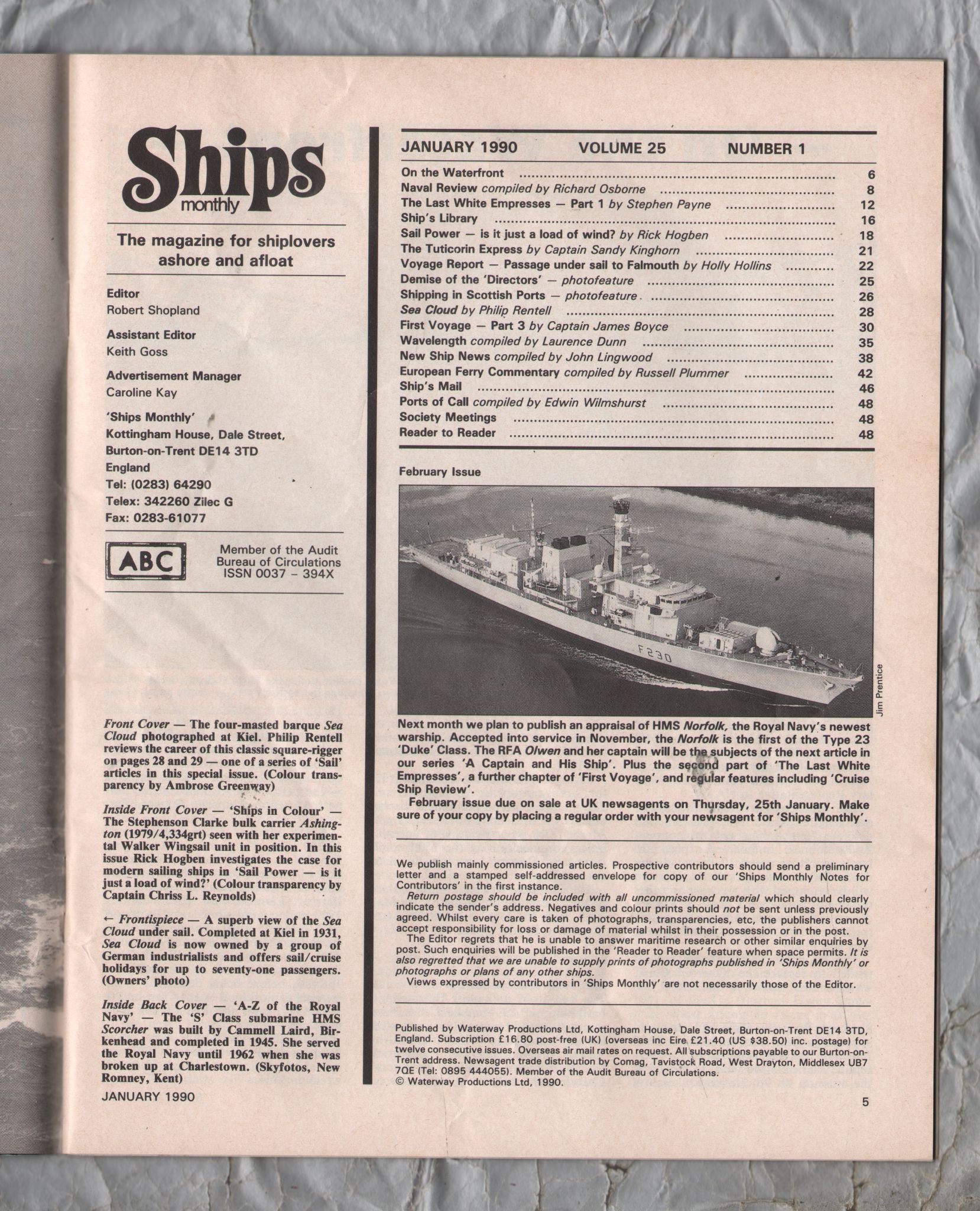 Ships Monthly - January 1990 - Vol 25 - No.1 - `Passage to Falmouth` - Waterway Productions Limited