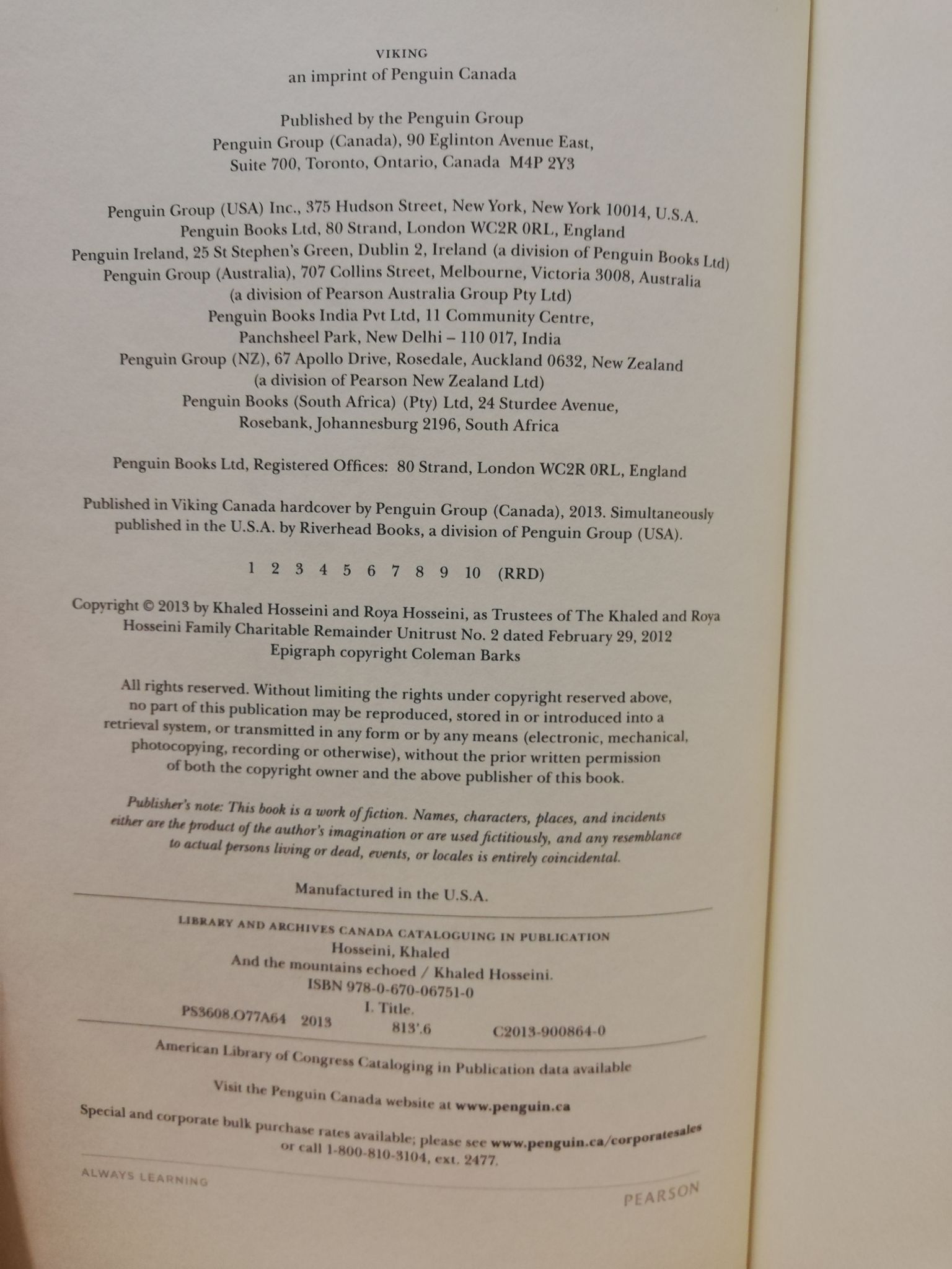 Tags: And the Mountains Echoed, Khaled Hosseini, 1st Canadian Edition, 1st Print, Hbk, Viking, 2013