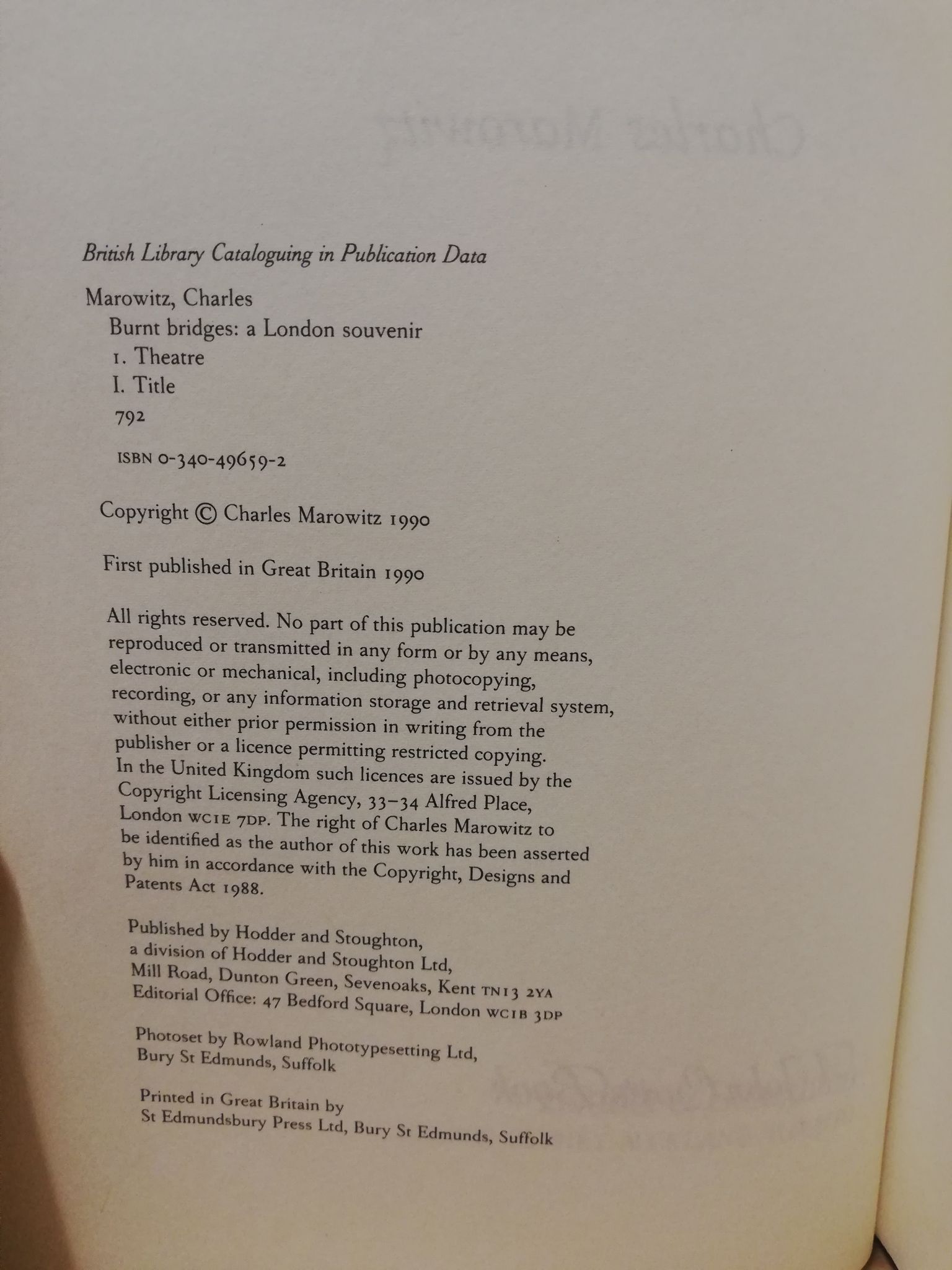 Tags: Burnt Bridges, Charles Marowitz:First U.K Print, Hodder & Stoughton, 1990