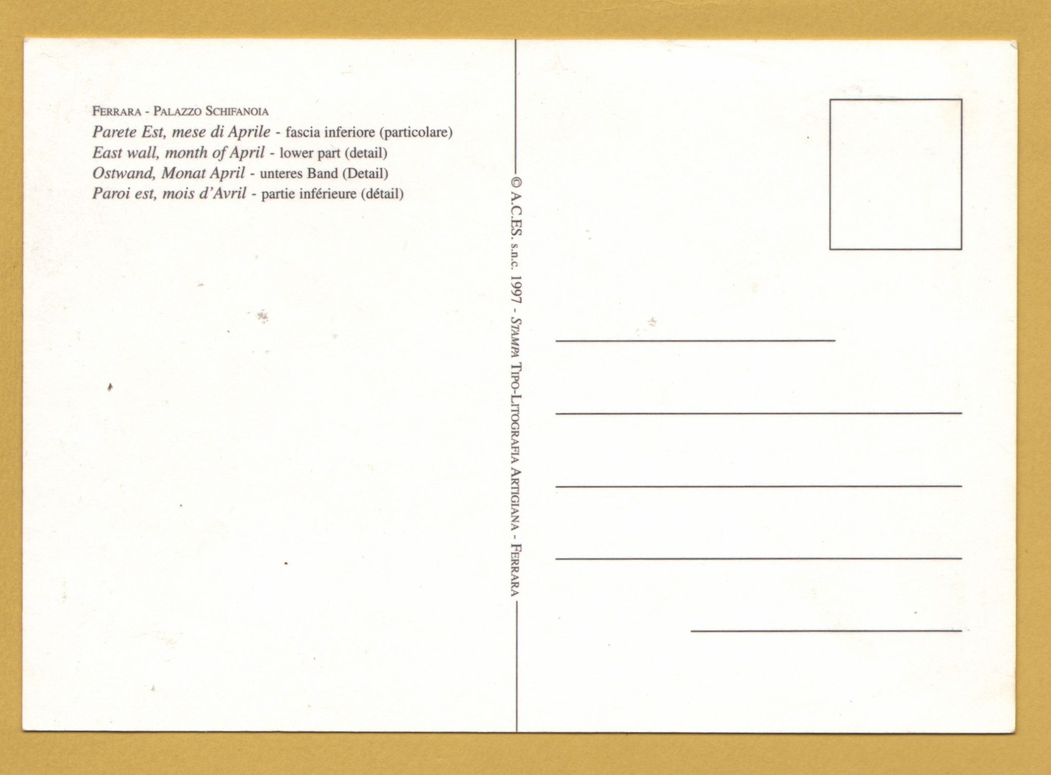 `Allegory of April - Triumph of Venus - East Wall, Lower Part (detail) by Francesco Del Cossa` - Postally Unused - 1997 - A.C.ES. s.n.c. Postcard. `Allegory of April - Triumph of Venus - East Wall, Lower Part (detail) by Francesco Del Cossa` - Postally Unused - 1997 - A.C.ES. s.n.c. Postcard.