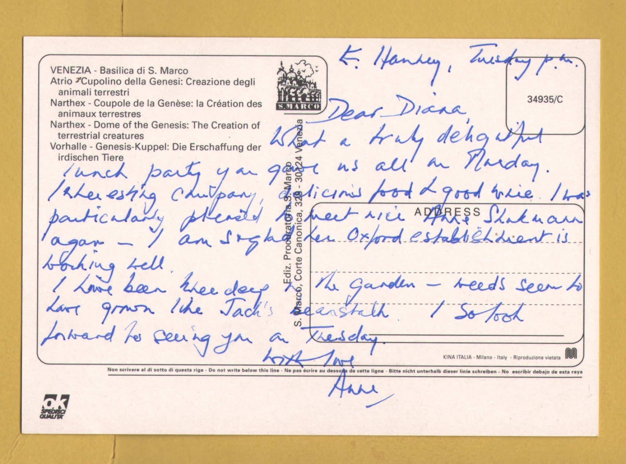 `Narthex - Dome of the Genesis: The Creation of Terrestrial Creatures - Venice` - Postally Unused (although message written to rear) - S.Marco Postcard.