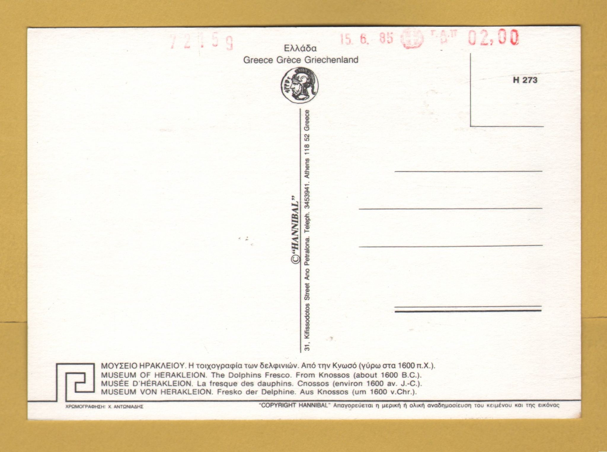 Tags: Heraklion Museum, The Dolphins Fresco from Knossos:Unused, Hannibal Postcard.