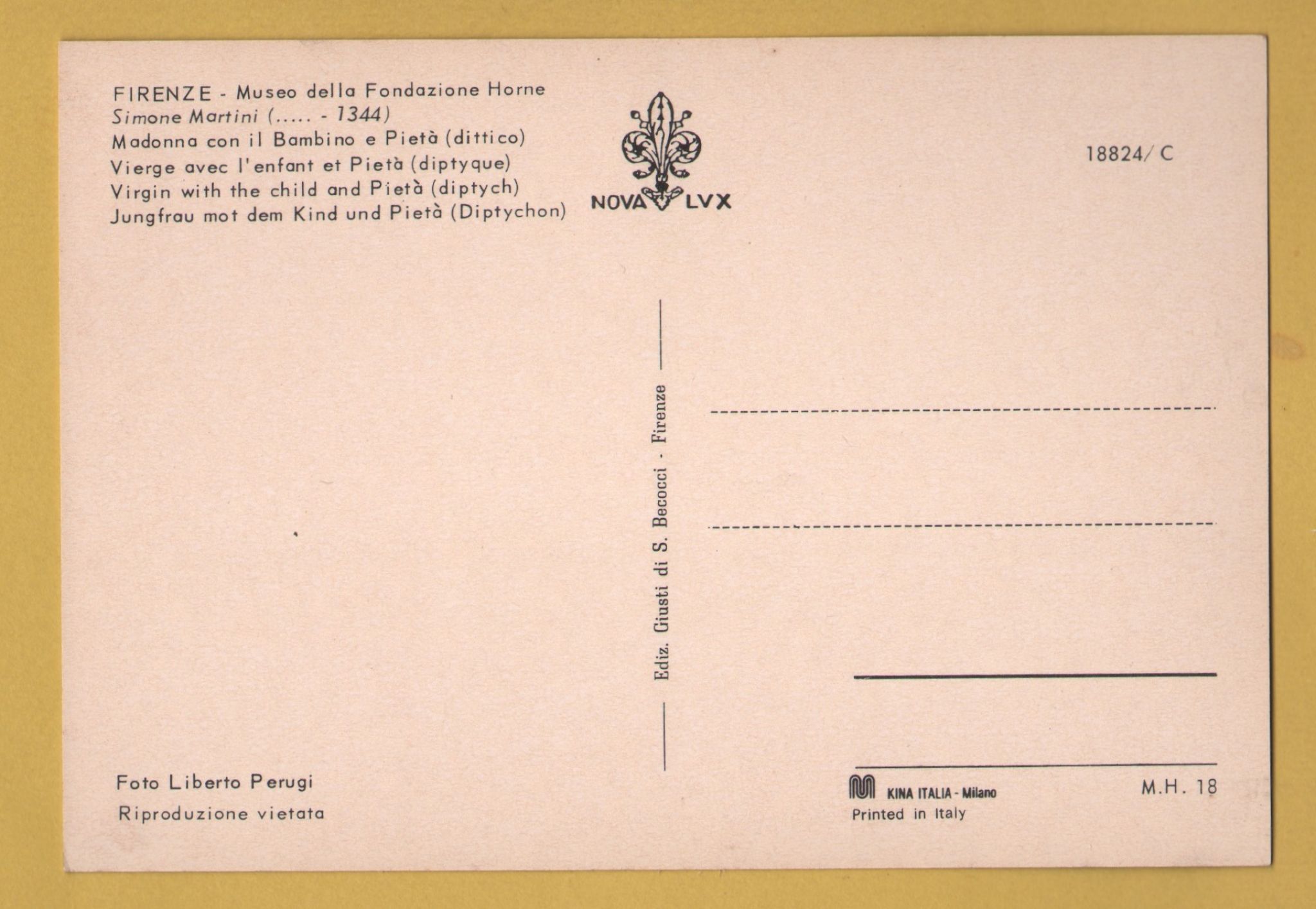 `Florence - Horne Foundation Museum `Madonna and Child with Pieta (diptych) by Simone Martini`` - Postally Unused - Nova LVX Postcard. `Florence - Horne Foundation Museum `Madonna and Child with Pieta (diptych) by Simone Martini`` - Postally Unused - Nova LVX Postcard.