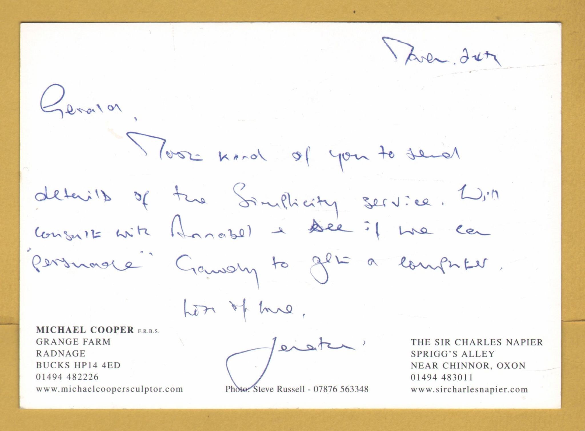 Michael Cooper & The Sir Charles Napier Restaurant Postcard.