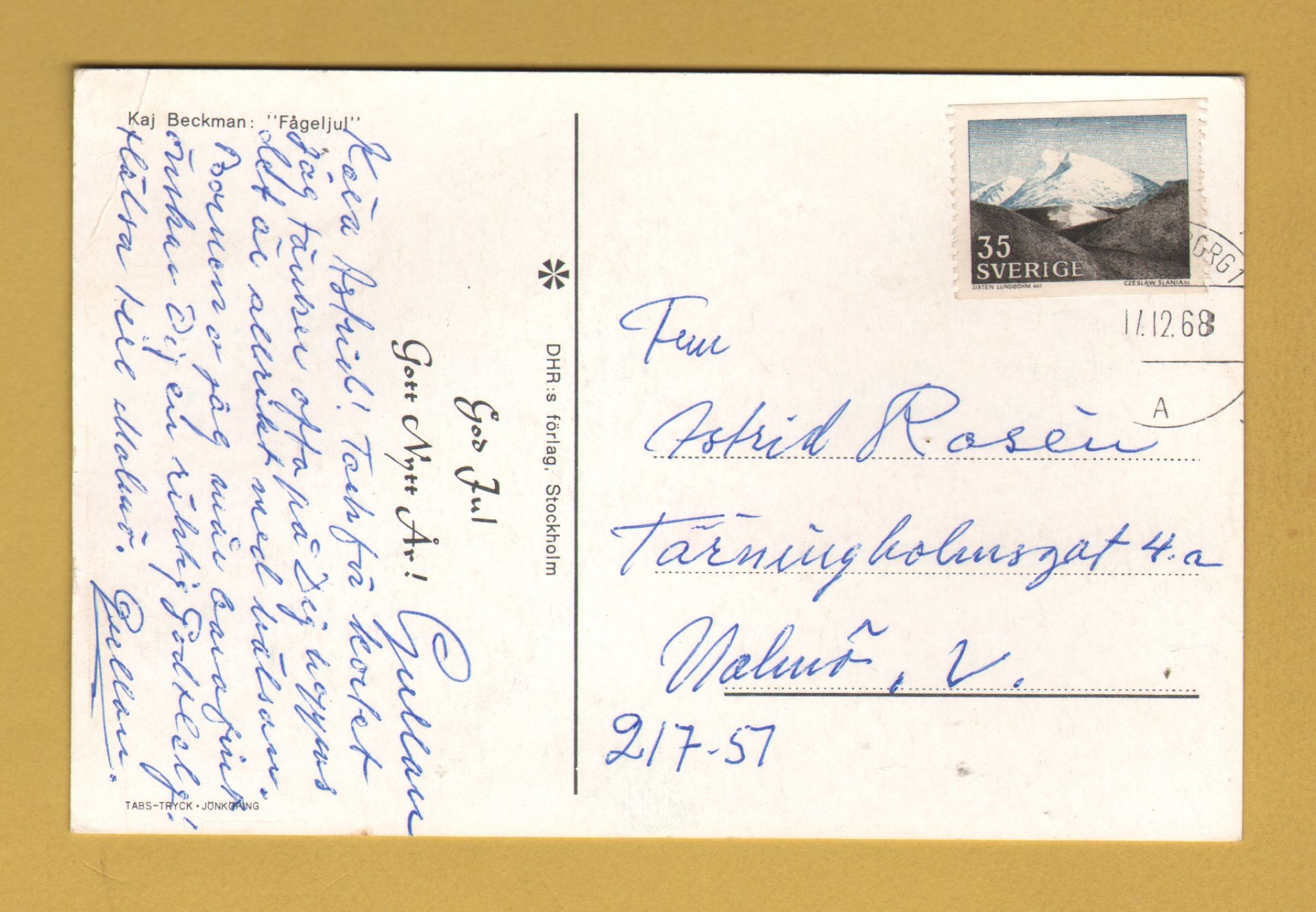Tags: Bird Christmas, Kaj Beckman, Swedish Card:Used, 1968, DHR Publishing Postcard.