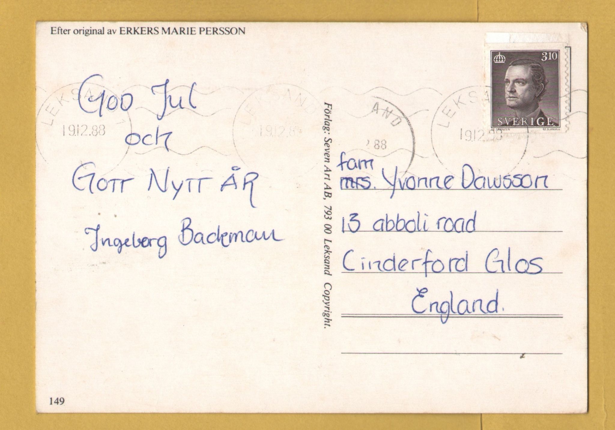 Tags: Merry Christmas, Happy New Year, Erkers Marie Persson, Swedish Card:Used, 1988, Seven Art Postcard.