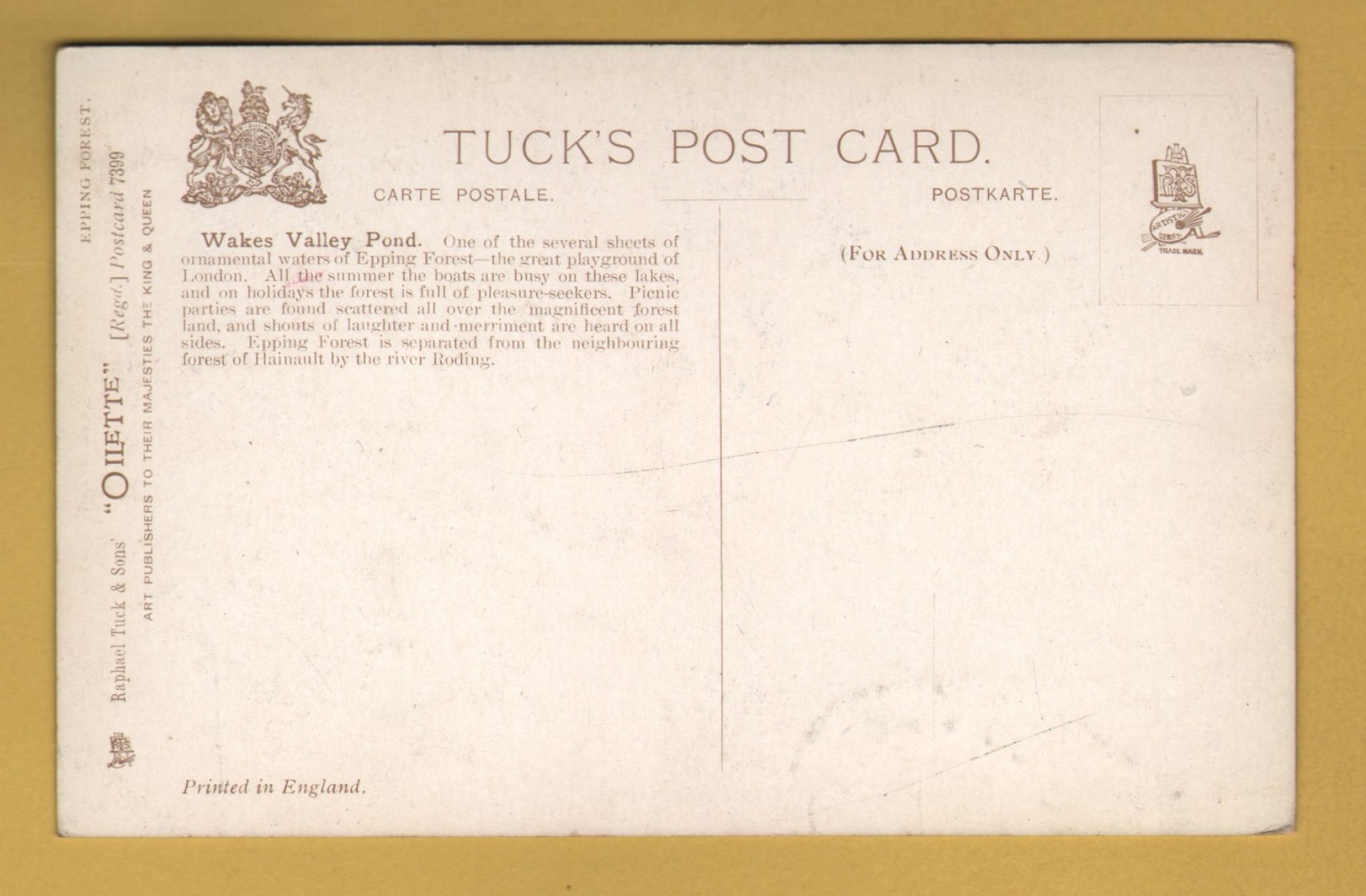 `Epping Forest - `Epping Forest, Wakes Valley Pond` - Oilette - 7399` - Postally Unused - Raphael Tuck & Sons Postcard. `Epping Forest - `Epping Forest, Wakes Valley Pond` - Oilette - 7399` - Postally Unused - Raphael Tuck & Sons Postcard.
