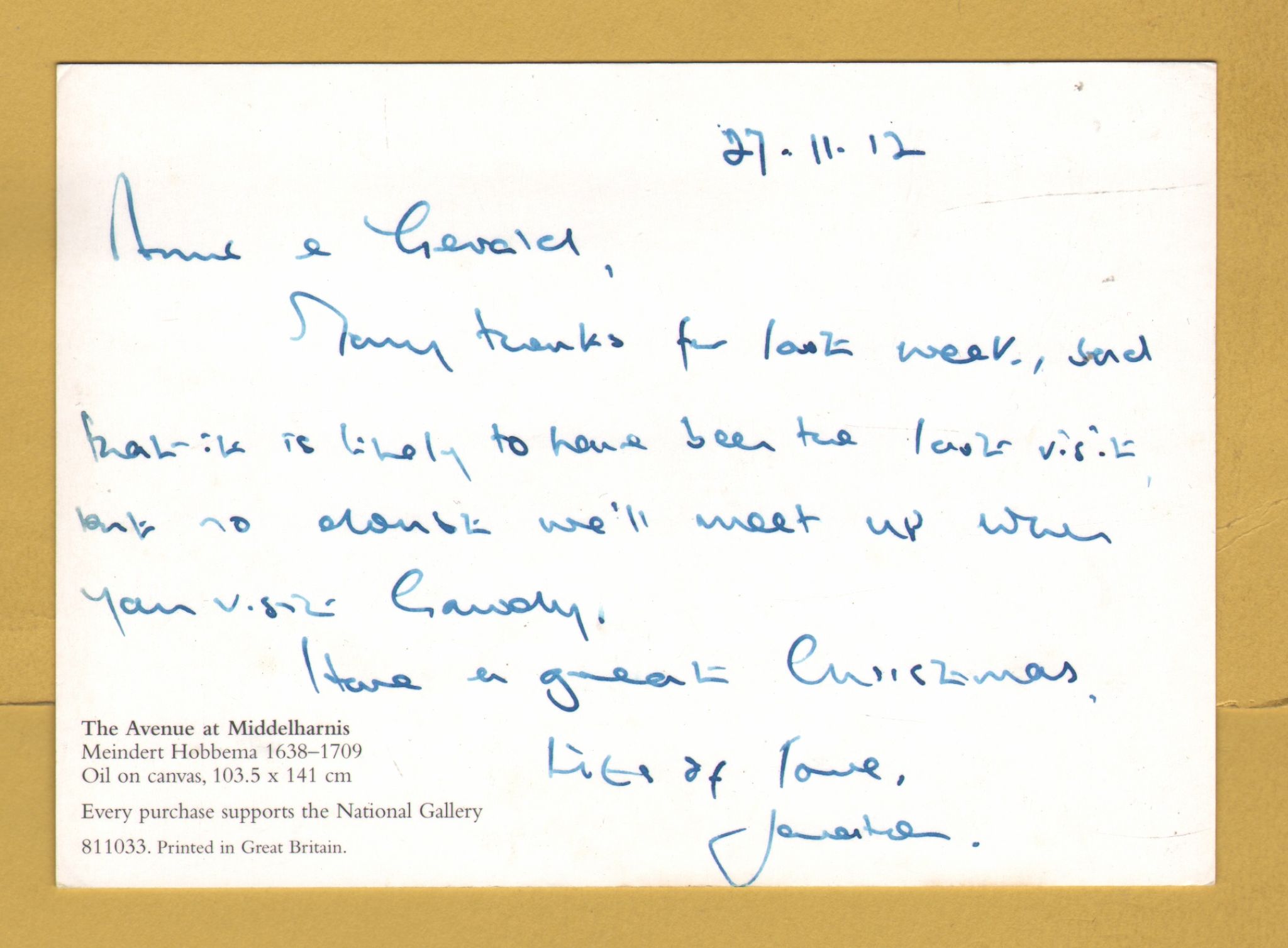 `The Avenue at Middelharnis by Meindert Hobbema` - Postally Unused (although message written to rear) - National Gallery Postcard. `The Avenue at Middelharnis by Meindert Hobbema` - Postally Unused (although message written to rear) - National Gallery Postcard.