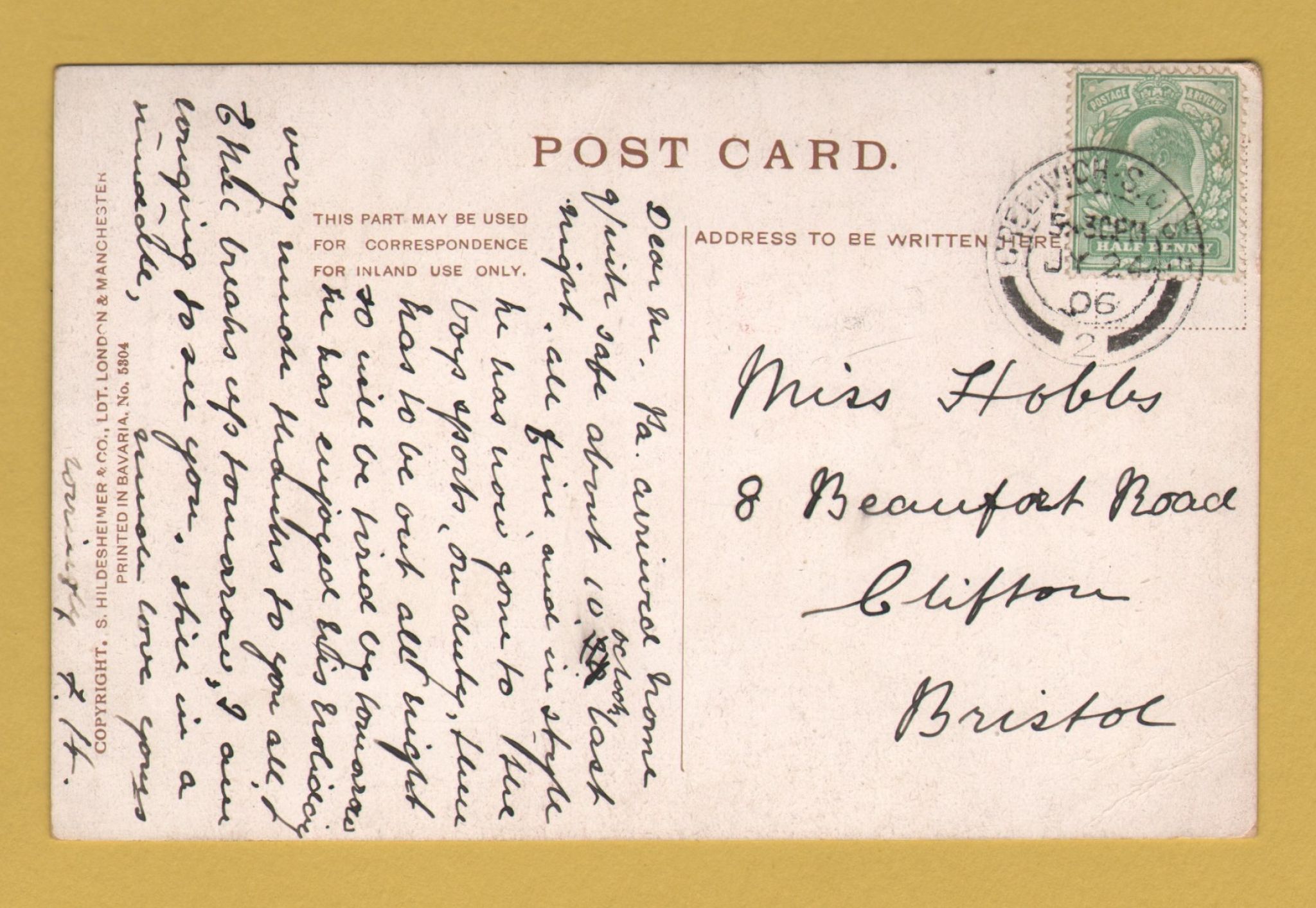`Nr Mapledurham, R.Gallon` - Postally Used - Greenwich S.O 22nd July 1906 Postmark - S.Hildesheimer & Co Postcard. `Nr Mapledurham, R.Gallon` - Postally Used - Greenwich S.O 22nd July 1906 Postmark - S.Hildesheimer & Co Postcard.