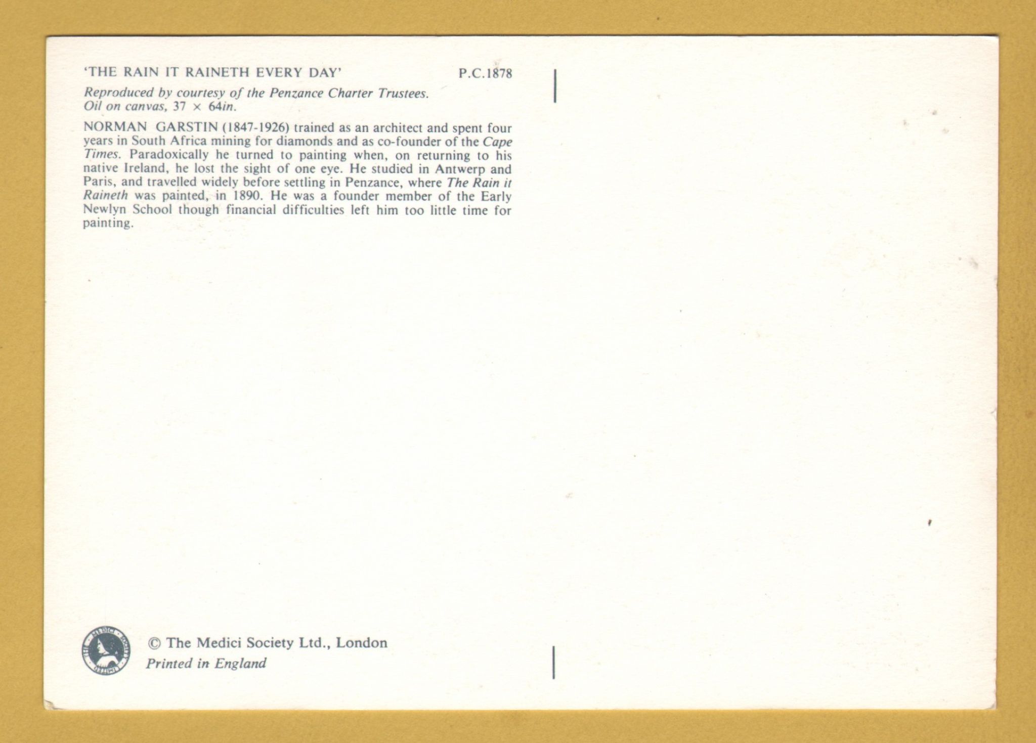 Tags: The Rain it Raineth Every Day, Martin Garstin:Unused, The Medici Society Postcard.