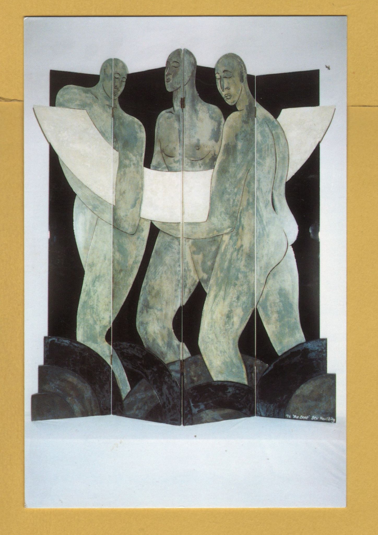 `4 Fold Screen, `The Boat` by Bev Houlding` - Postally Unused - Malthouse Postcard. `4 Fold Screen, `The Boat` by Bev Houlding` - Postally Unused - Malthouse Postcard.