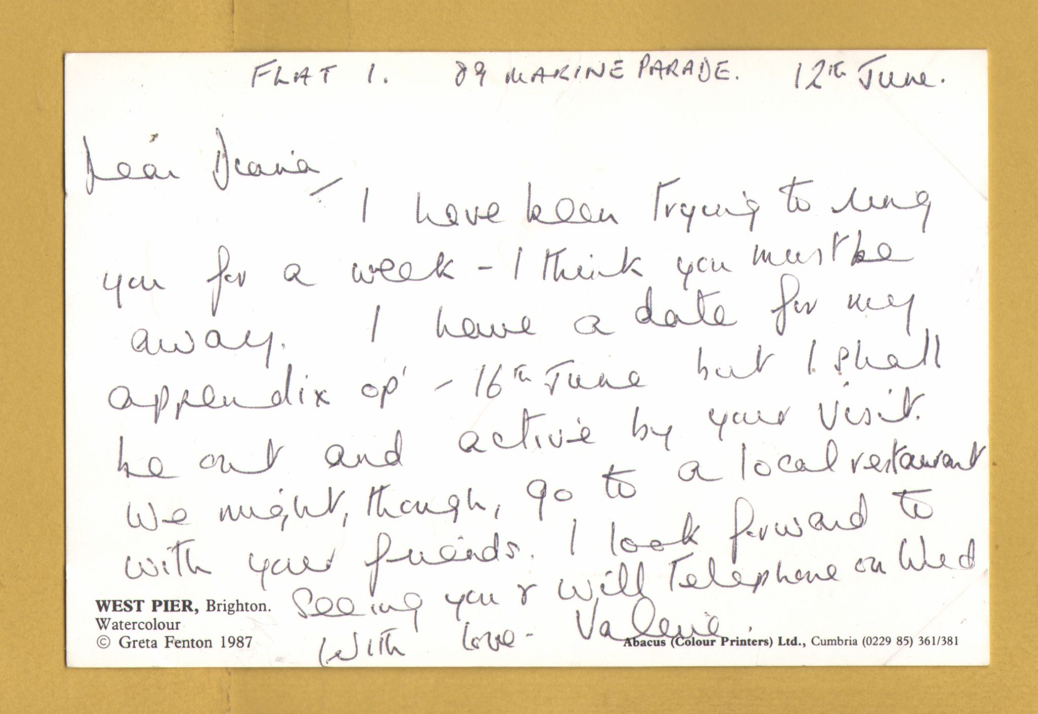 `West Pier, Brighton 1987 by Greta Fenton` - Postally Unused (although message written to rear) - Abacus Postcard. `West Pier, Brighton 1987 by Greta Fenton` - Postally Unused (although message written to rear) - Abacus Postcard.