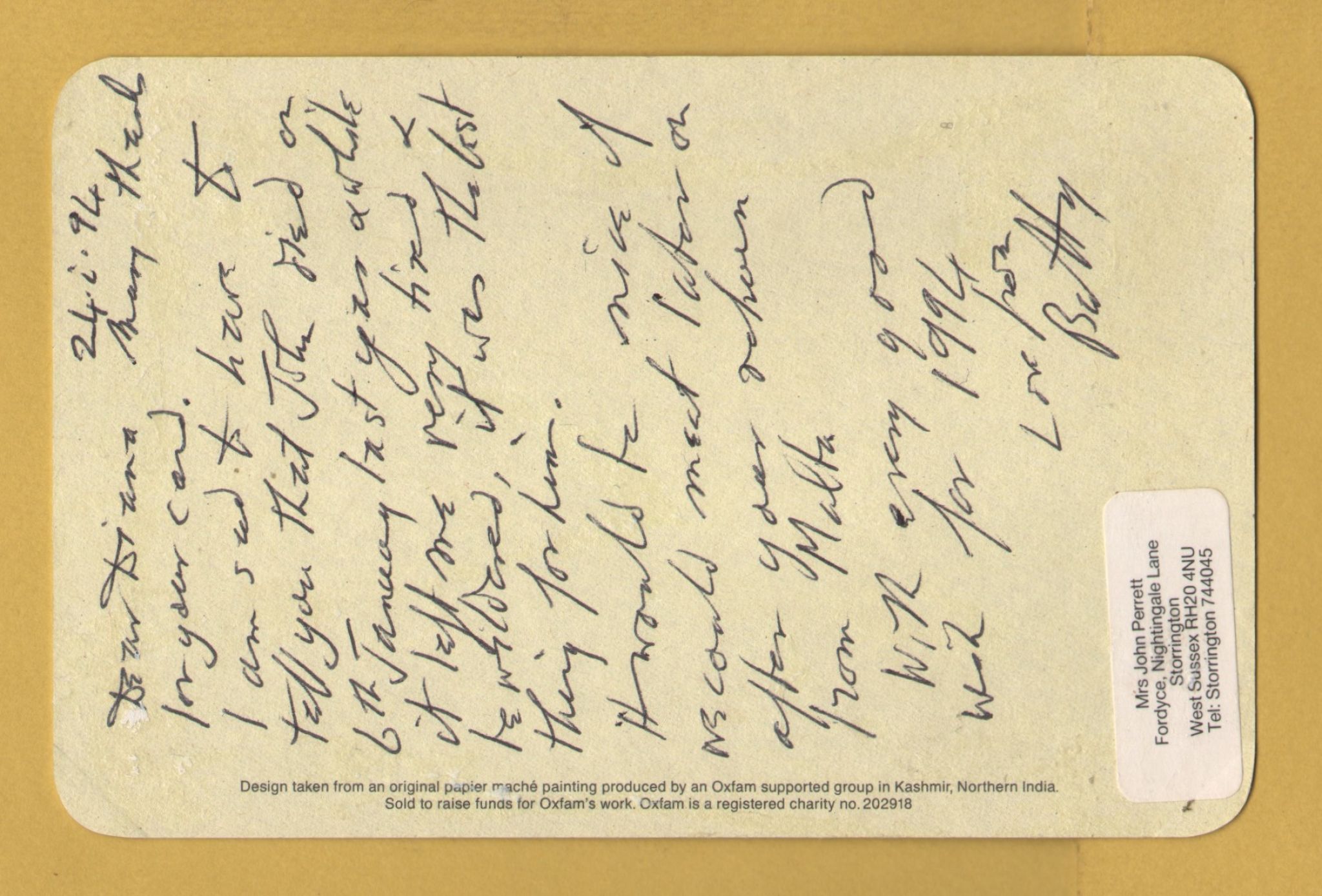 `Taken from Papier Mache Painting Produced by an Oxfam Group in Kashmir` - Postally Unused (although message written to rear) - Oxfam Postcard. `Taken from Papier Mache Painting Produced by an Oxfam Group in Kashmir` - Postally Unused (although message written to rear) - Oxfam Postcard.