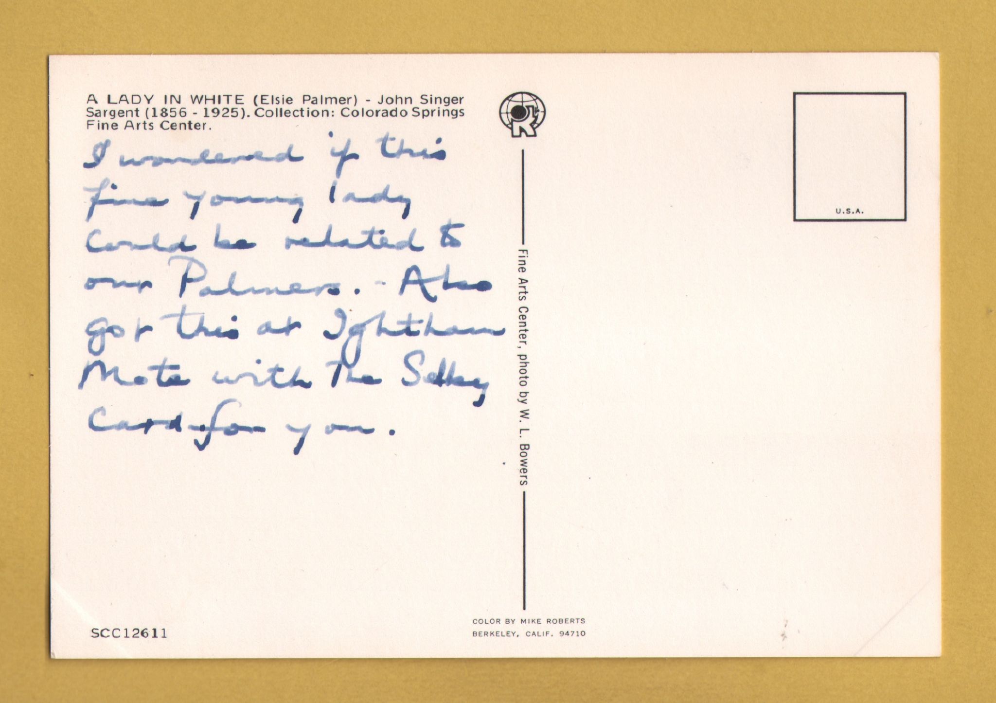 `A Lady in White (Elsie Palmer) by John Singer Sargent` - Postally Unused (although message written to rear) - Fine Arts Center, Colorado Springs Postcard. `A Lady in White (Elsie Palmer) by John Singer Sargent` - Postally Unused (although message written to rear) - Fine Arts Center, Colorado Springs Postcard.