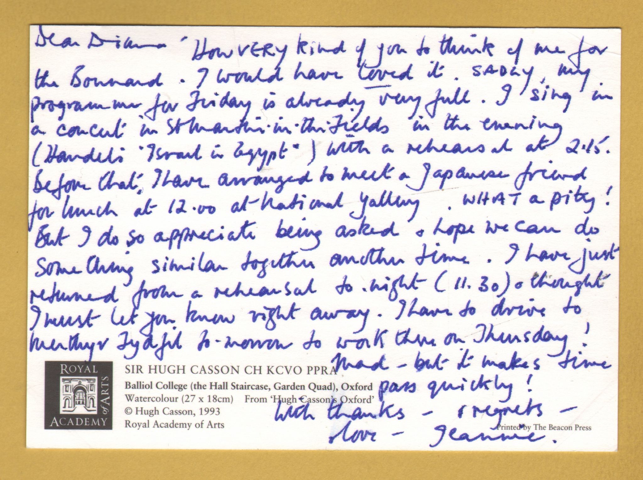 `Balliol College (The Hall Staircase, Garden Quad) Oxford` - Postally Unused (although message written to rear) - Royal Academy of Arts Postcard. `Balliol College (The Hall Staircase, Garden Quad) Oxford` - Postally Unused (although message written to rear) - Royal Academy of Arts Postcard.