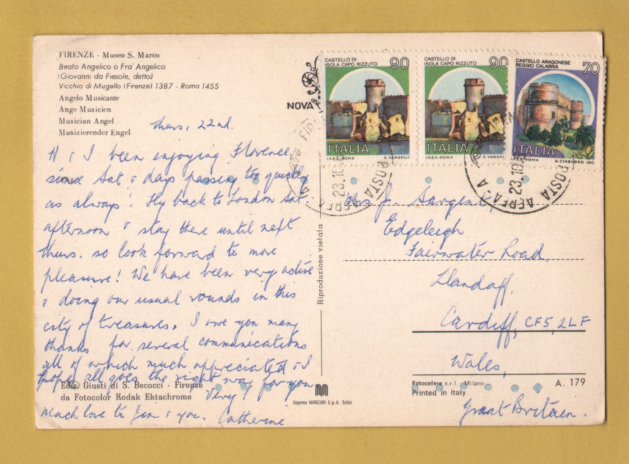 `Florence, S.Marco Museum - Musician Angel by Fra Angelico` - Postally Used-1980 - Nova Lux Postcard. `Florence, S.Marco Museum - Musician Angel by Fra Angelico` - Postally Used-1980 - Nova Lux Postcard.