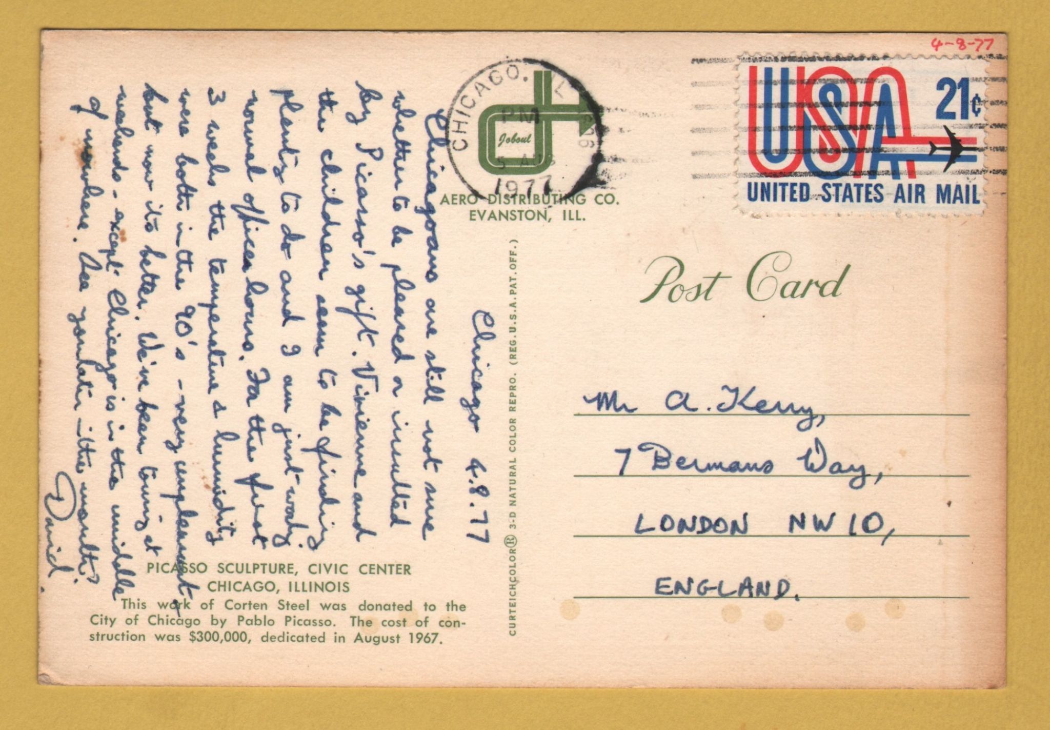 `Picasso Sculpture, Civic Center, Chicago, Illinois` - Postally Used-1977 - Curteichcolor Postcard.