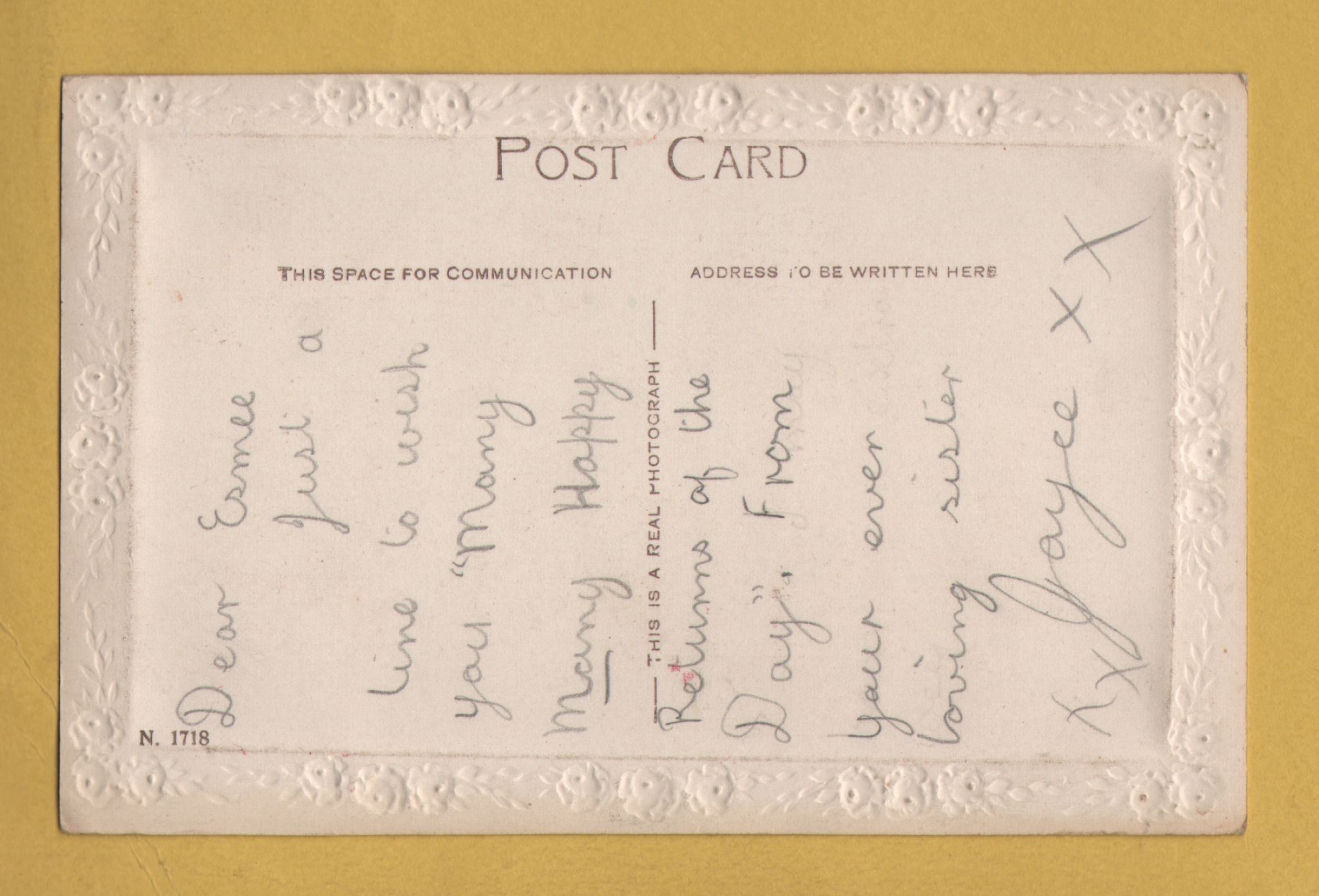 `To My Sister Wishing You Joy On Your Birthday` - Postally Unused (although message written to rear) - Producer Unknown Postcard. `To My Sister Wishing You Joy On Your Birthday` - Postally Unused (although message written to rear) - Producer Unknown Postcard.
