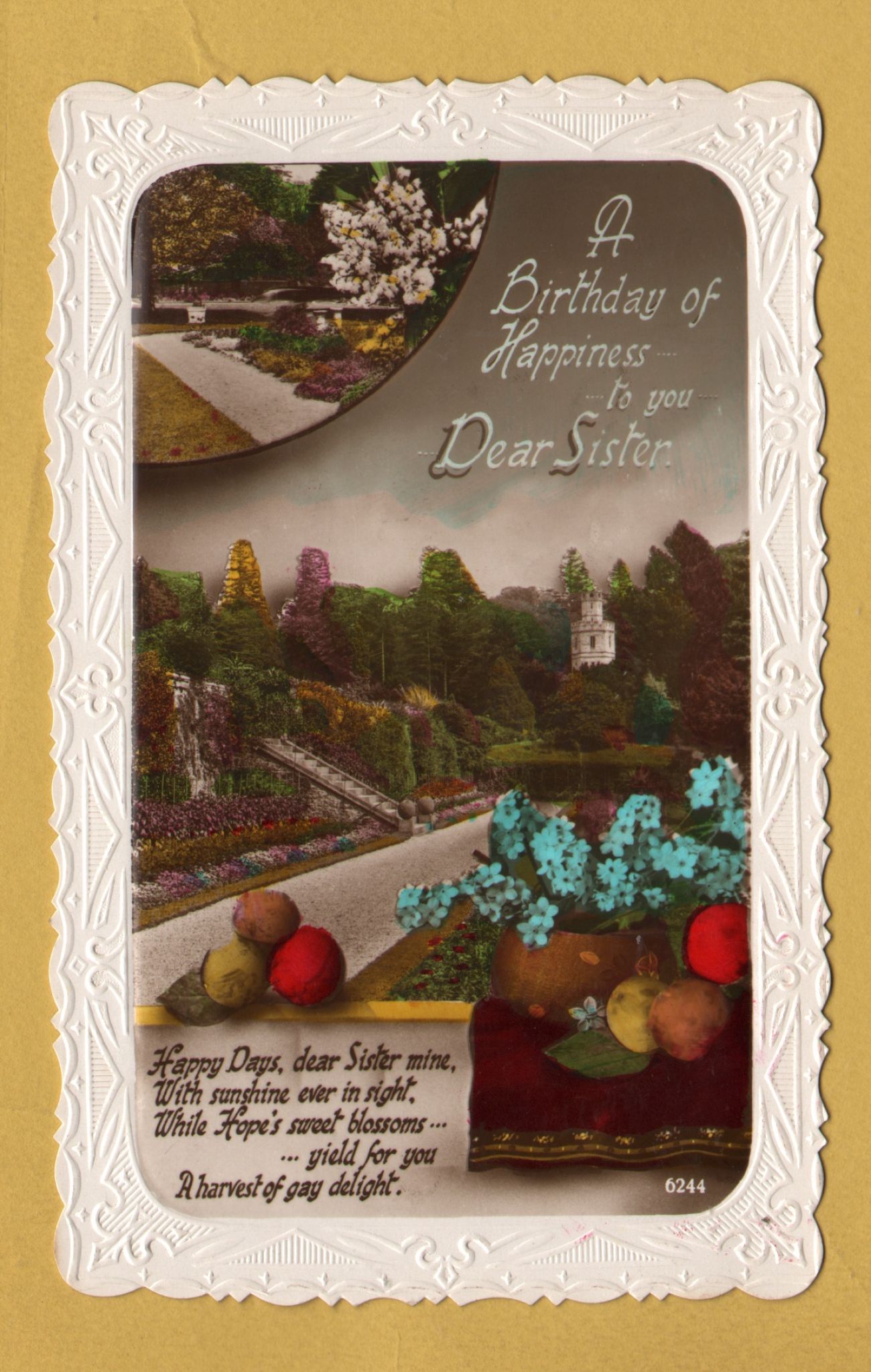 `A Birthday of Happiness to you Dear Sister` - Postally Unused (although message written to rear) - Producer Unknown Postcard.