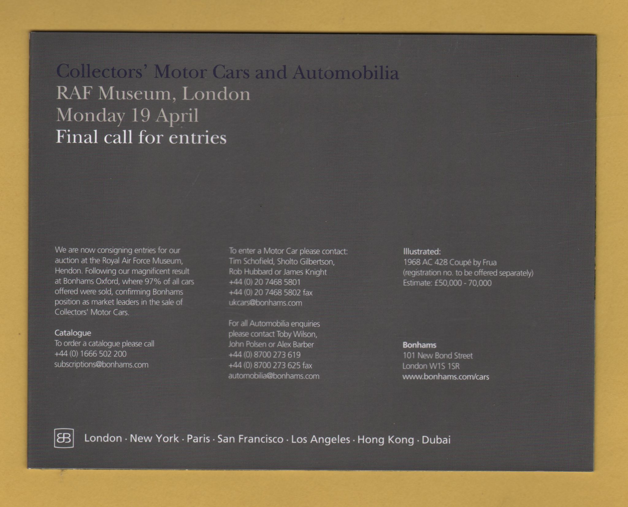 Bonhams - Sale of Collectors` Motor Cars and Automobilia -`Final Call For Entries` - RAF Museum, London - Monday 19 April 2010
