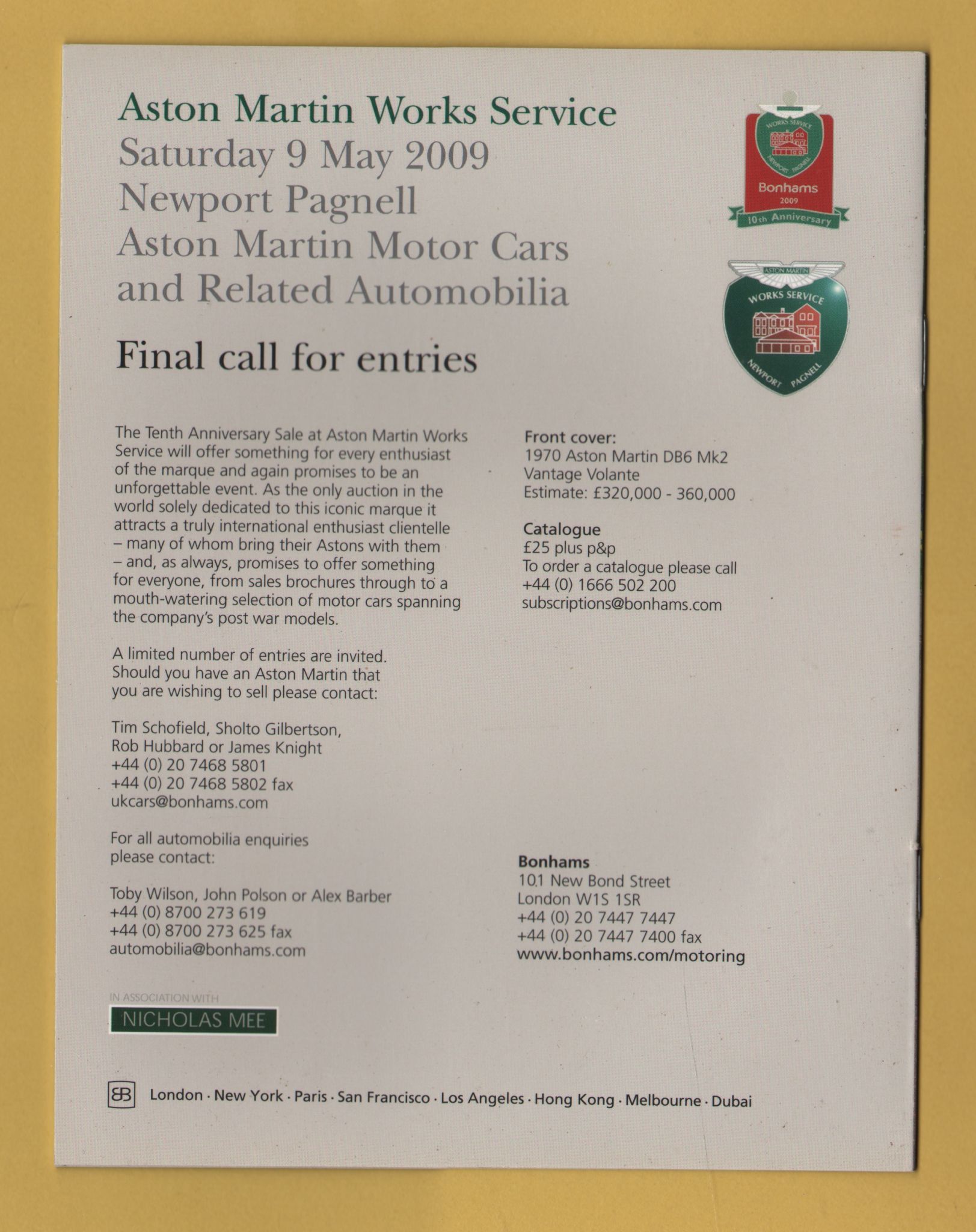 Bonhams - Aston Martin Motor Cars and Related Automobilia -`Final Call For Entries` - Newport Pagnell - Saturday 9 May 2009 Bonhams - Aston Martin Motor Cars and Related Automobilia -`Final Call For Entries` - Newport Pagnell - Saturday 9 May 2009 Bonhams - Aston Martin Motor Cars and Related Automobilia -`Final Call For Entries` - Newport Pagnell - Saturday 9 May 2009
