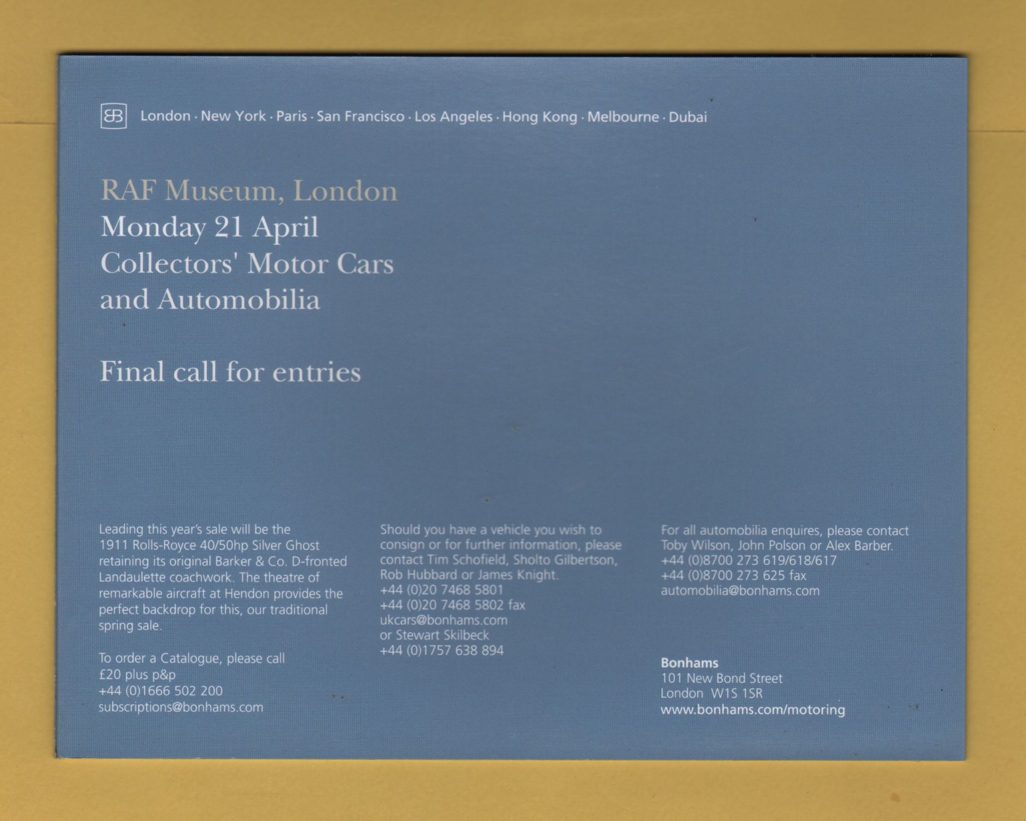 Bonhams - Sale of Collectors` Motor Cars and Automobilia -`Final Call For Entries` - RAF Museum, London - Monday 21 April 2010