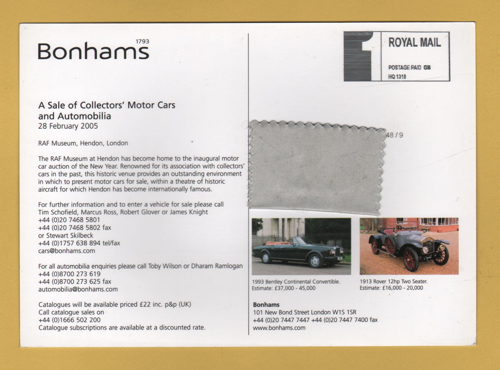Bonhams - Sale of Collectors` Motor Cars and Automobilia -`Entries Are Invited` - RAF Museum, London - Monday 28 February 2005