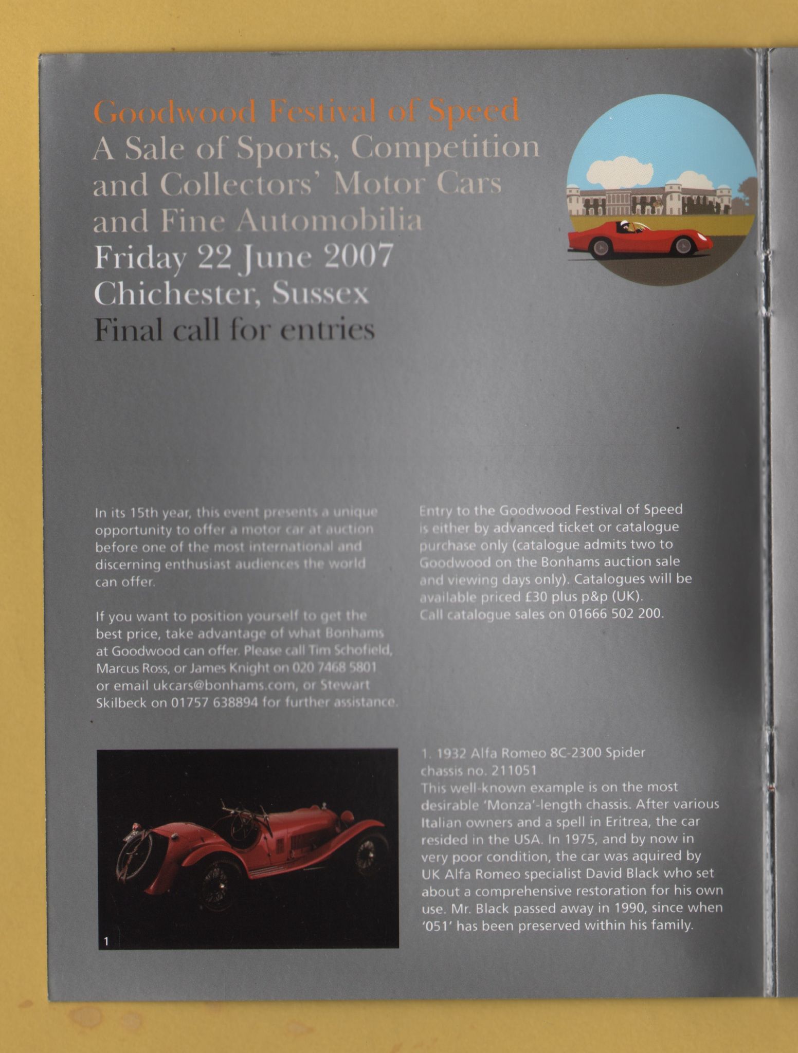 Bonhams - Sale of Sports, Competition and Collectors` Motor Cars and Fine Automobilia -`Final Call For Entries` - Goodwood - Friday 22 June 2007