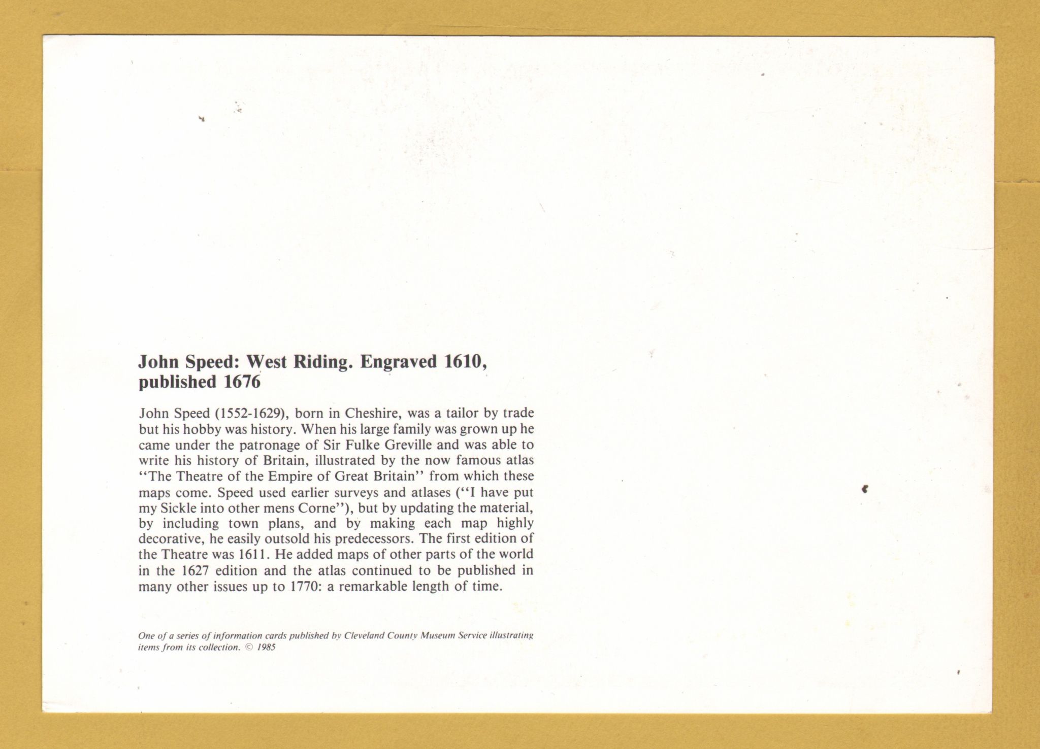 `John Speed: West Riding. Engraved 1610, Published 1676` - Postally Unused - Cleveland County Museum Postcard `John Speed: West Riding. Engraved 1610, Published 1676` - Postally Unused - Cleveland County Museum Postcard