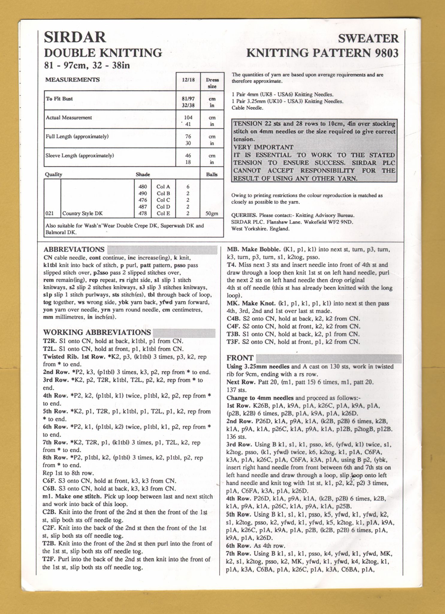 Tags: Sirdar, Country Style, Double Knitting, 32-38", No.9803, Sweater:Knitting Pattern