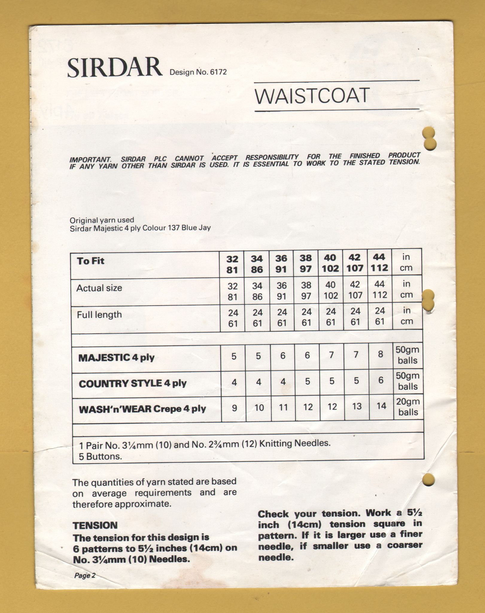 Tags: Sirdar, 4 Ply, 32-44", No.6172, Waistcoat:Knitting Pattern